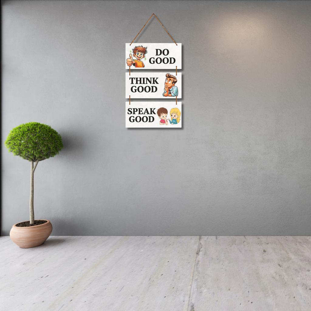 Encourage good manners and moral values in your little ones with this vibrant and educational “Do Good, Think Good, Speak Good” Kids Wall Hanging. Designed with three neatly aligned wooden panels, this piece features fun cartoon characters that visually represent each message, making it engaging and easy to understand for children.