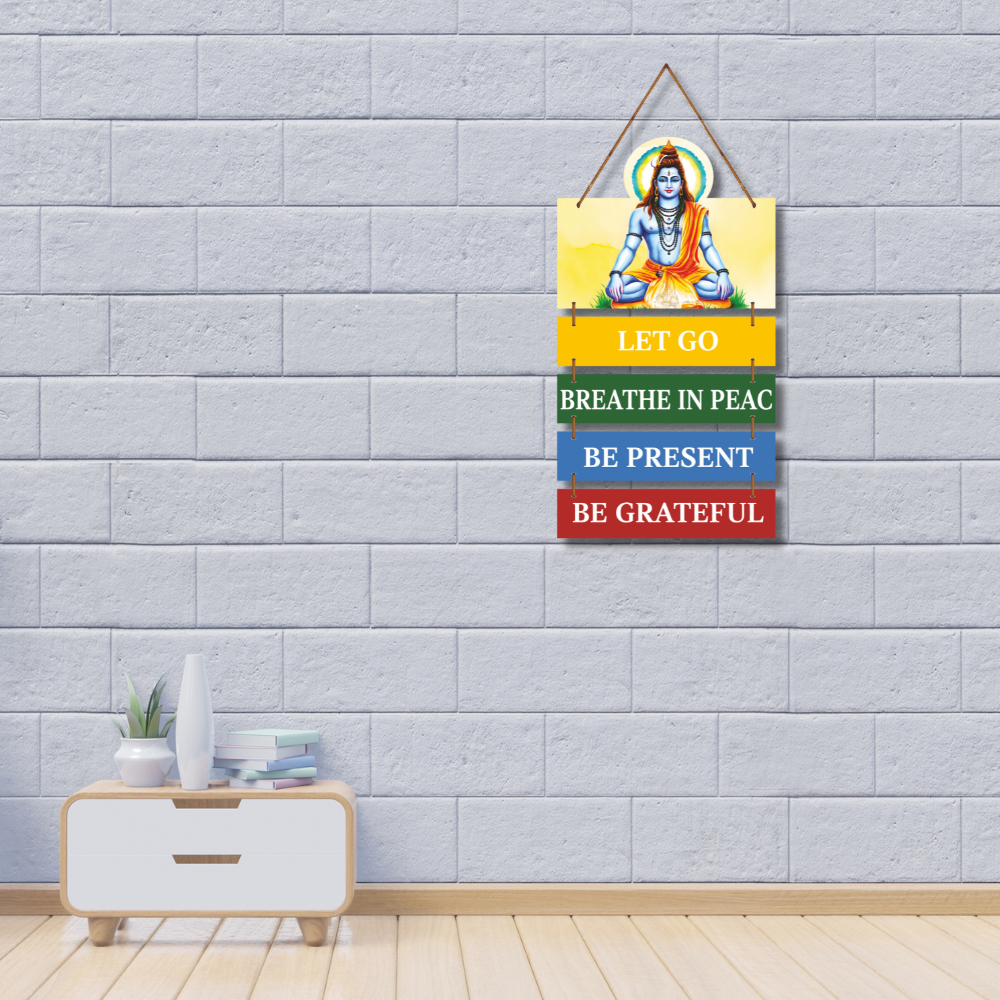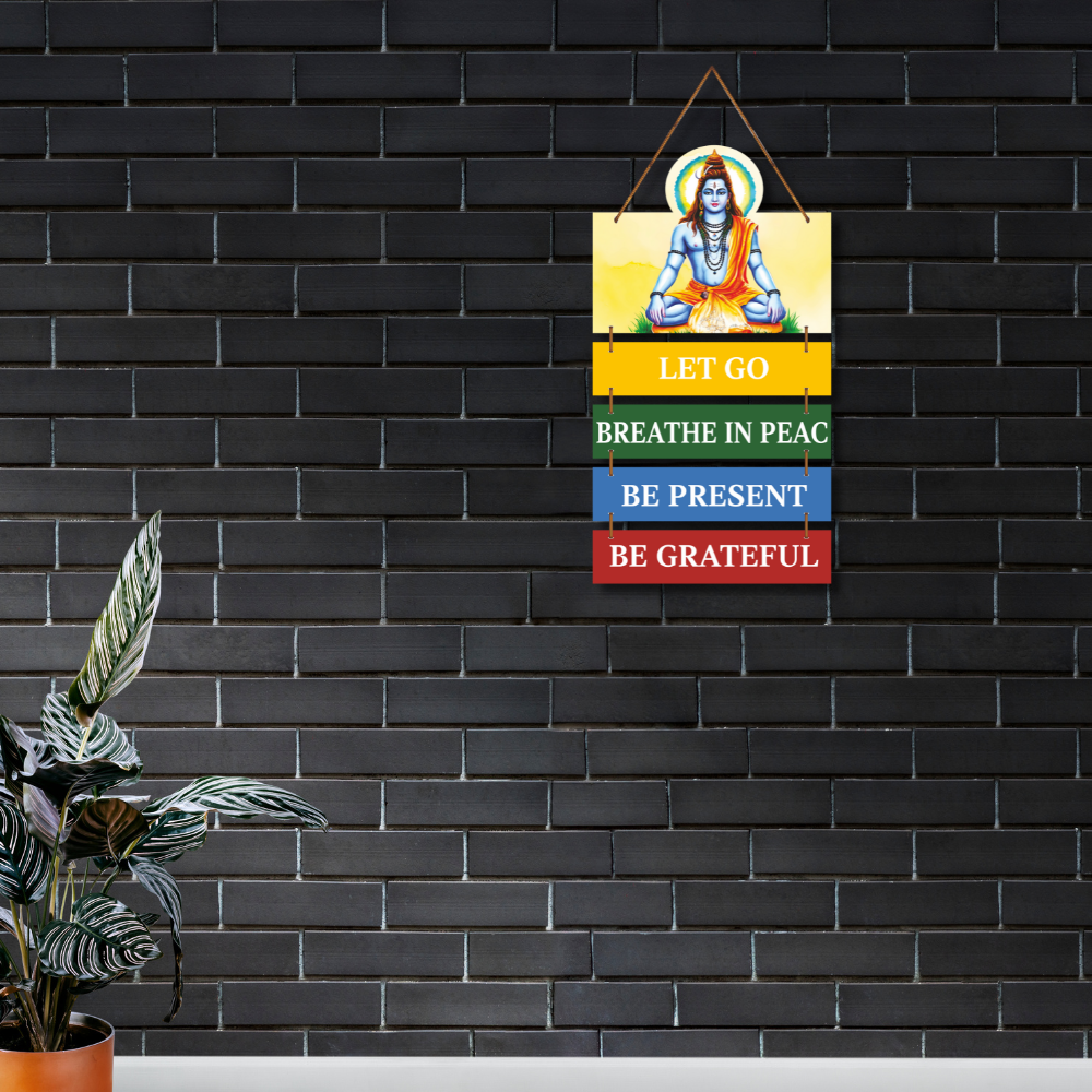 Embrace inner calm and spiritual strength with this vibrant Lord Shiva wooden wall hanging. Featuring serene artwork of Shiva with motivational quotes like “Let Go, Breathe in Peace, Be Present, Be Grateful”, it inspires mindfulness and positivity. Perfect for meditation rooms, pooja spaces, or gifting, this décor piece radiates peace and divine energy.