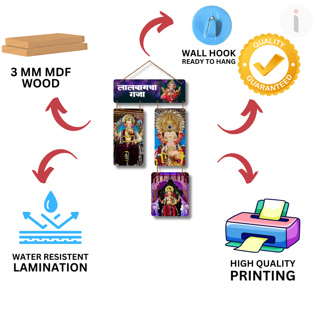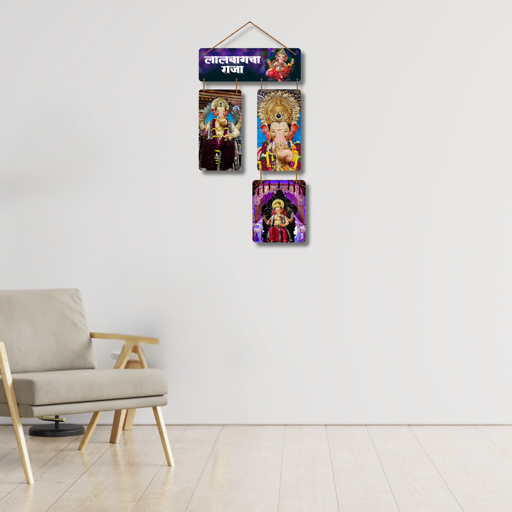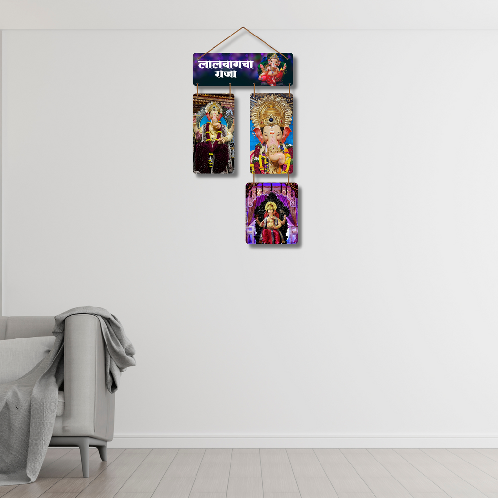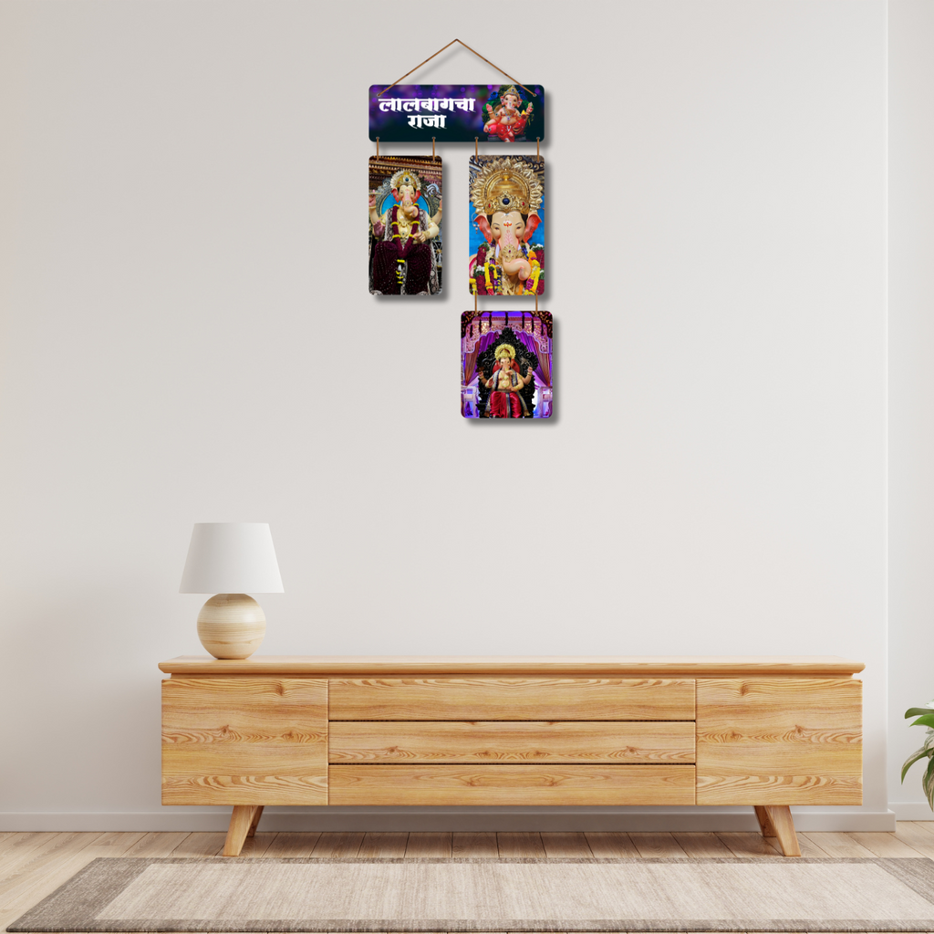 Bring divine blessings and festive vibrance into your home with this beautiful Lalbaugcha Raja Wooden Wall Hanging, featuring four vibrant panels of the most beloved and iconic form of Lord Ganesha – Lalbaugcha Raja. The top plaque bears the Marathi inscription “लालबागचा राजा” with a decorative Ganpati image, followed by three stunning images of the Lalbaugcha Raja idol in all its grandeur.