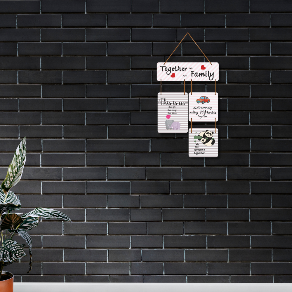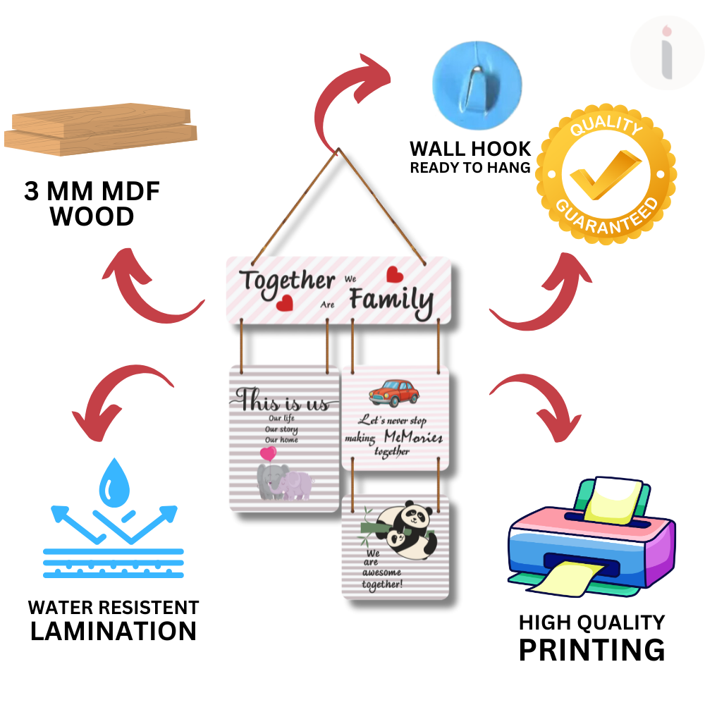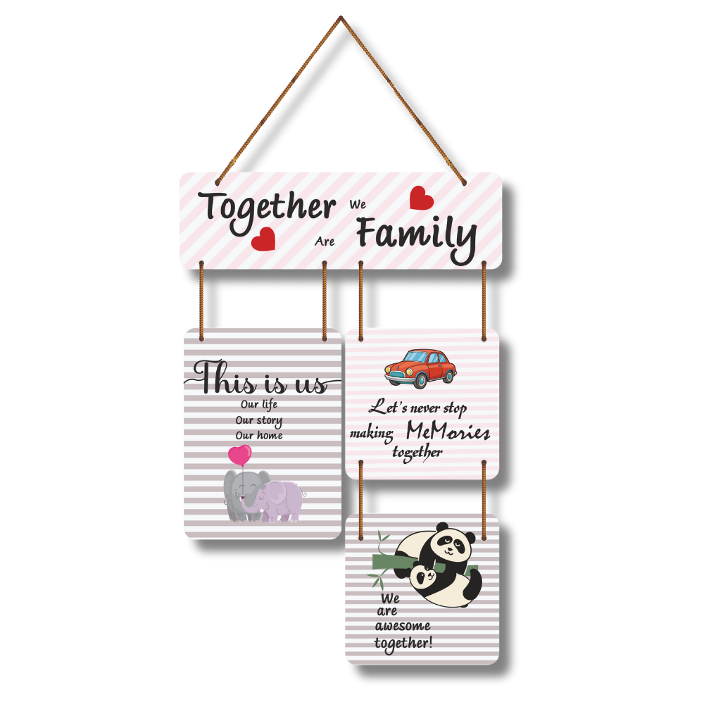 This heartwarming wall hanging celebrates the essence of family with the message, “Together we are family.” Adorned with charming designs of elephants, a car, and playful pandas, it symbolizes love, memories, and unity. Perfect for living rooms, bedrooms, or hallways, it adds a cozy and affectionate touch, reminding everyone that family is life’s greatest blessing.