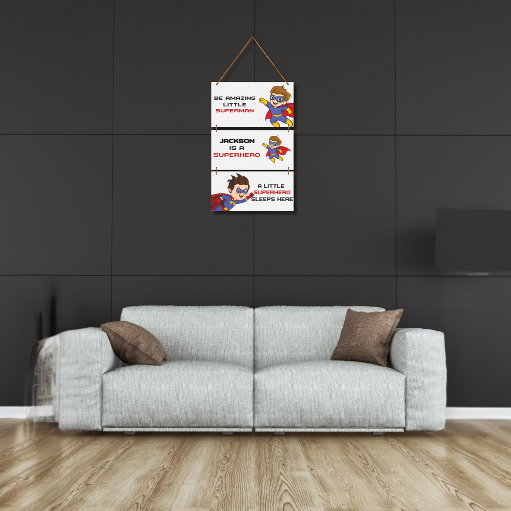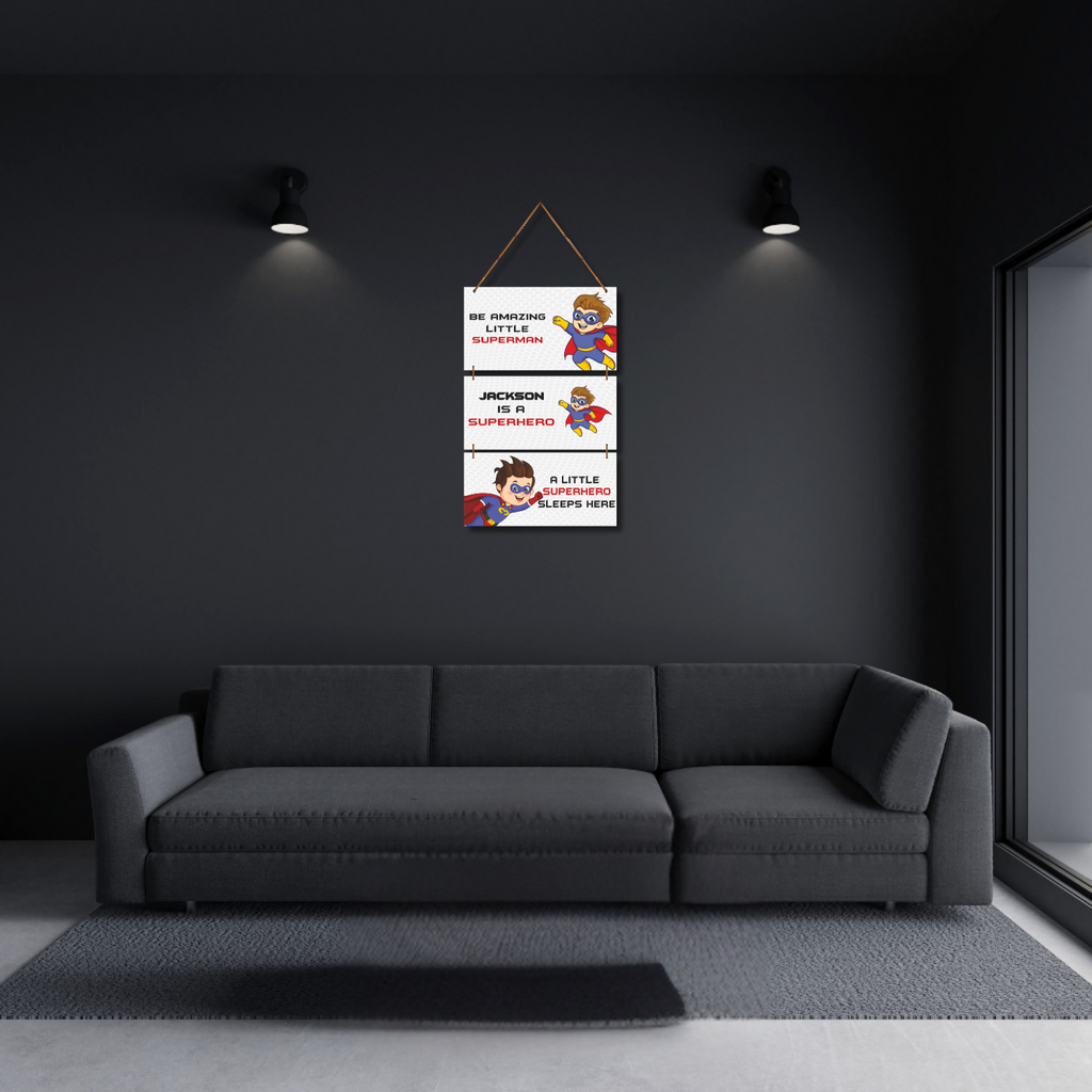 Add a burst of energy, fun, and inspiration to your child’s room with this playful “Little Superhero” wall hanging, featuring colorful cartoon-style superhero boys and empowering messages. Perfect for nurseries, toddler bedrooms, or play areas, this 3-panel décor piece celebrates courage and imagination. With dynamic fonts, bright colors, and cute illustrations, it becomes a personalized touch your little one will love waking up to.