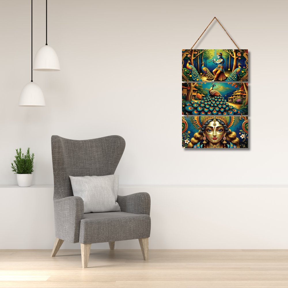 Infuse divine beauty into your home with this Spiritual Krishna–Peacock Wooden Wall Hanging 🎨🦚✨. Featuring Lord Krishna playing the flute, a majestic peacock, and a graceful goddess portrait, it symbolizes peace, devotion, and prosperity. Perfect for pooja rooms, living rooms, entrances, or gifting—this vibrant art transforms any space with spiritual charm and cultural elegance 🏡🙏💛