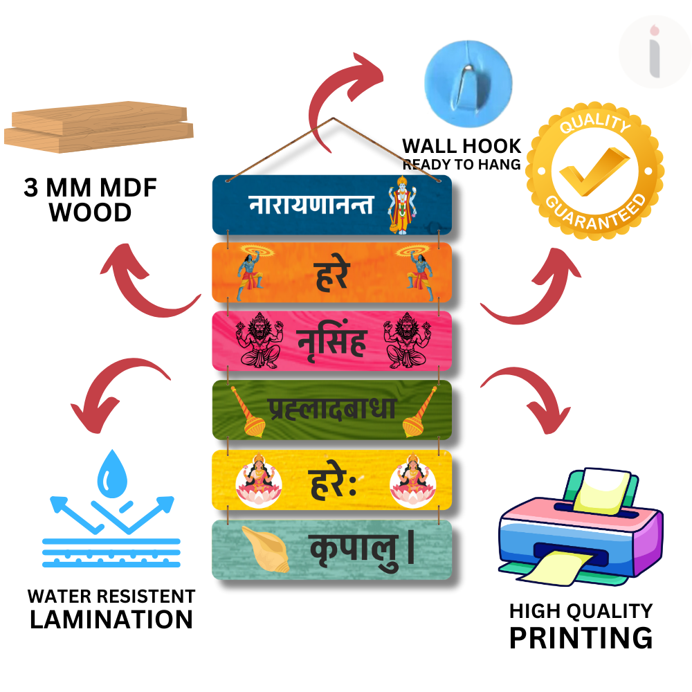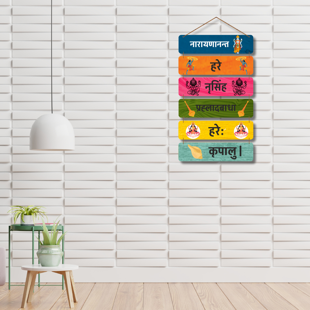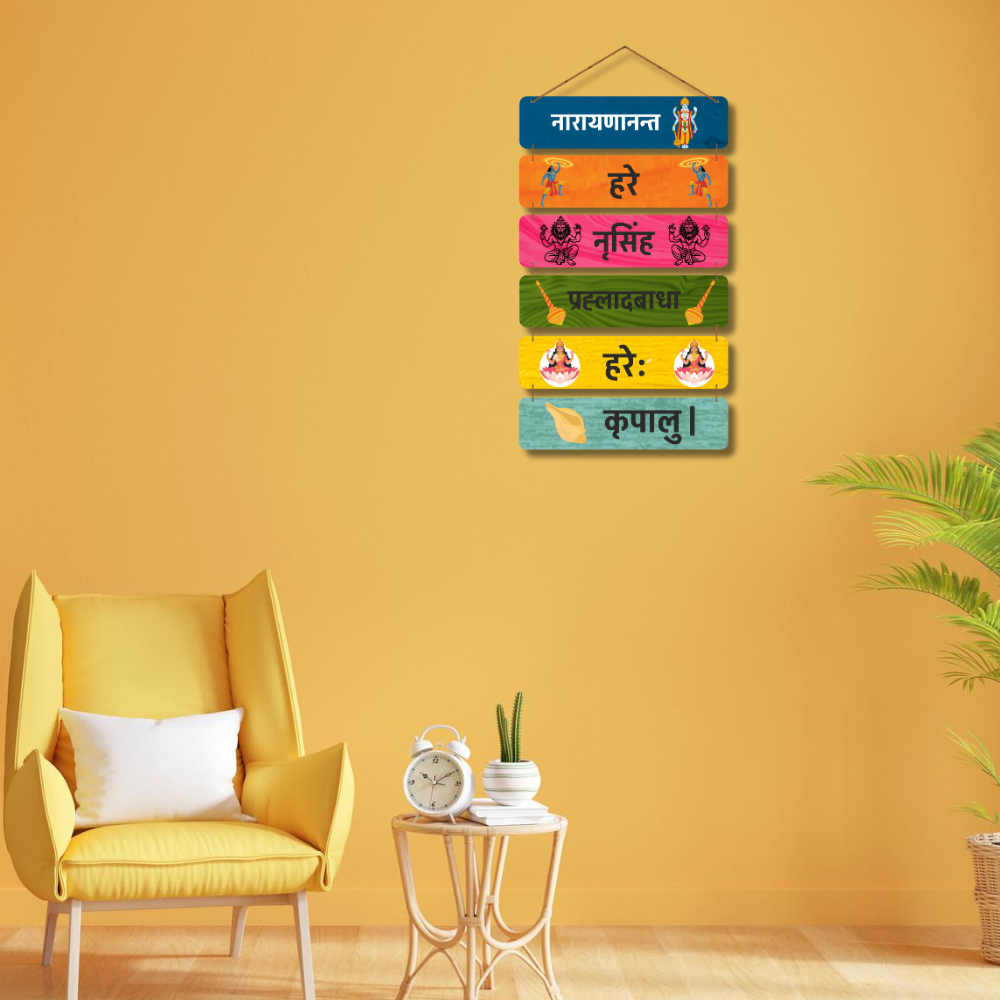 Adorn your home with this vibrant Narasimha Mantra wooden wall hanging, featuring the sacred chant “Narayana Nann Hare Narasimha Prahlada Bandhan Hareh Kapalu.” Symbolizing protection, devotion, and the victory of good over evil, it radiates spiritual energy. Perfect for pooja rooms, meditation spaces, or gifting, this décor brings divine strength and positivity.