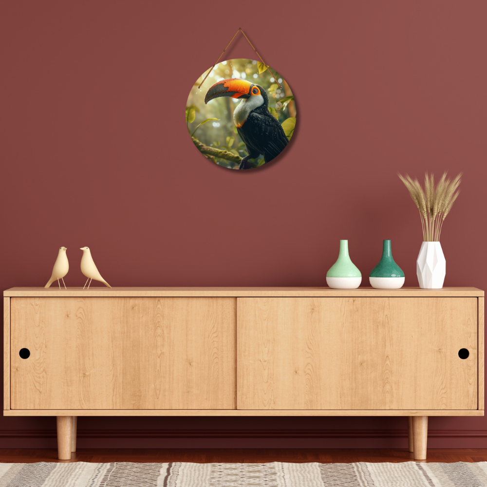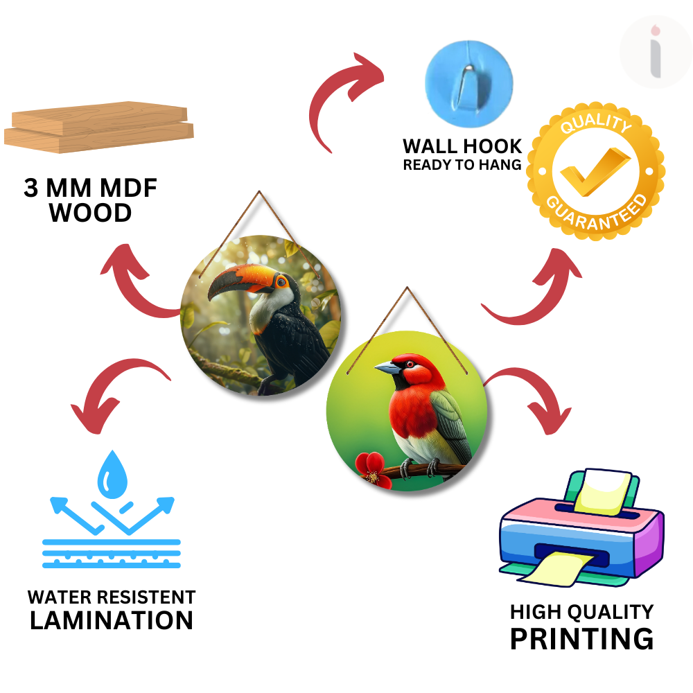 Bring the beauty of nature into your home with this stunning wooden wall hanging featuring vibrant exotic birds. One design showcases a bright red bird perched on a branch with a flower, while the other highlights a majestic toucan in a lush forest. Perfect for living rooms, balconies, or gifting, these pieces add elegance, color, and tropical charm.