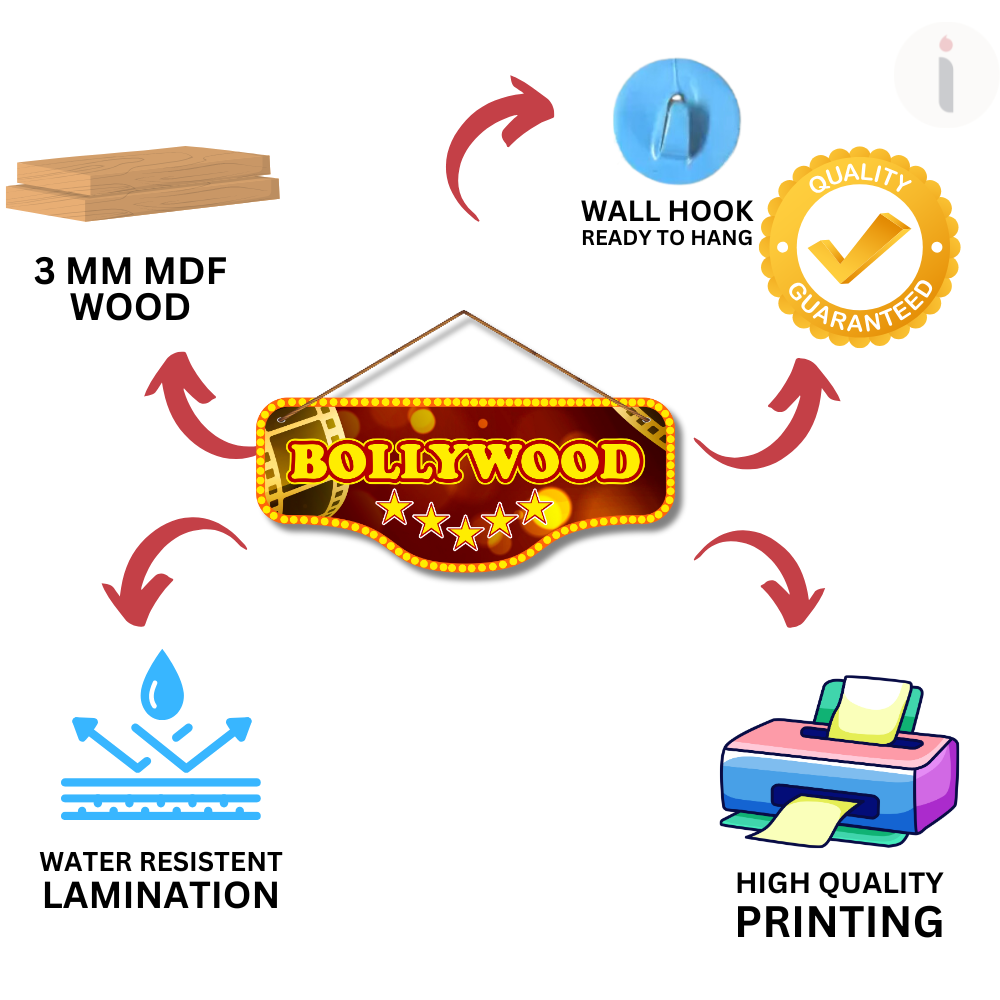 Bring the glamour of cinema into your space with this vibrant Bollywood-themed wooden wall hanging. Designed with bold lights, film reel accents, and star motifs, it captures the lively spirit of Indian movies. Perfect for home theaters, living rooms, or party décor, this eye-catching piece adds a touch of filmy charm and entertainment vibes to any wall.