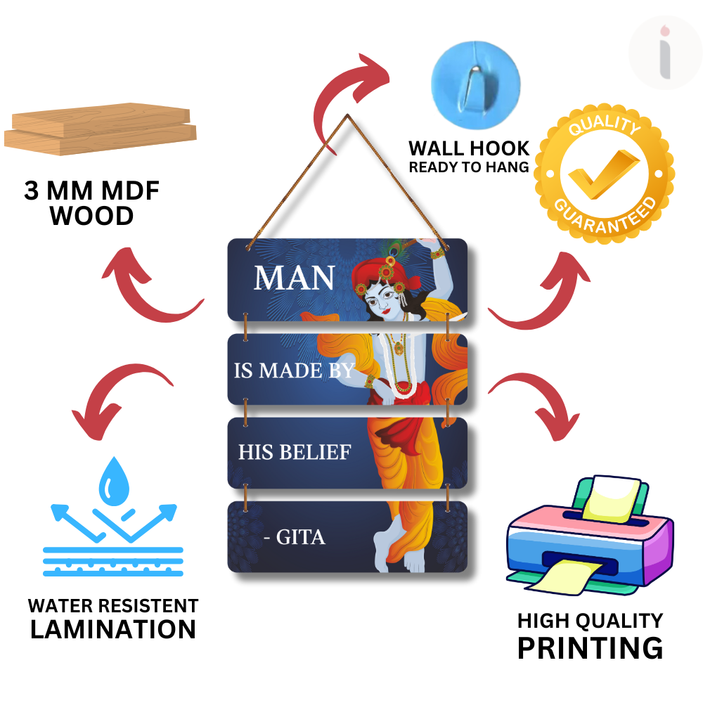 Shri Krishna wooden wall hanging featuring the Bhagavad Gita quote “Man is made by his belief.” Designed with vibrant Krishna artwork, it reminds us of the power of faith and positivity. Perfect for pooja rooms, meditation corners, or gifting spiritual guidance to loved ones.