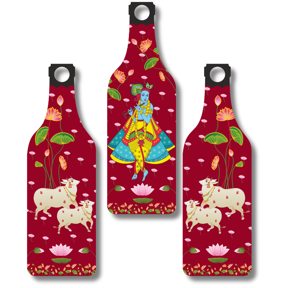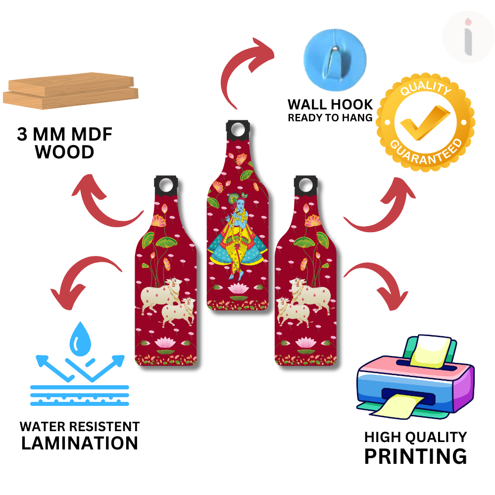 Adorn your home with this spiritual Krishna wall hanging, beautifully illustrated with Lord Krishna playing the flute, surrounded by lotus flowers and holy cows. Symbolizing peace, prosperity, and devotion, this artwork radiates divine charm and positivity. A perfect décor for your living room, pooja room, or gifting, it brings serenity and blessings of Lord Krishna into your space.