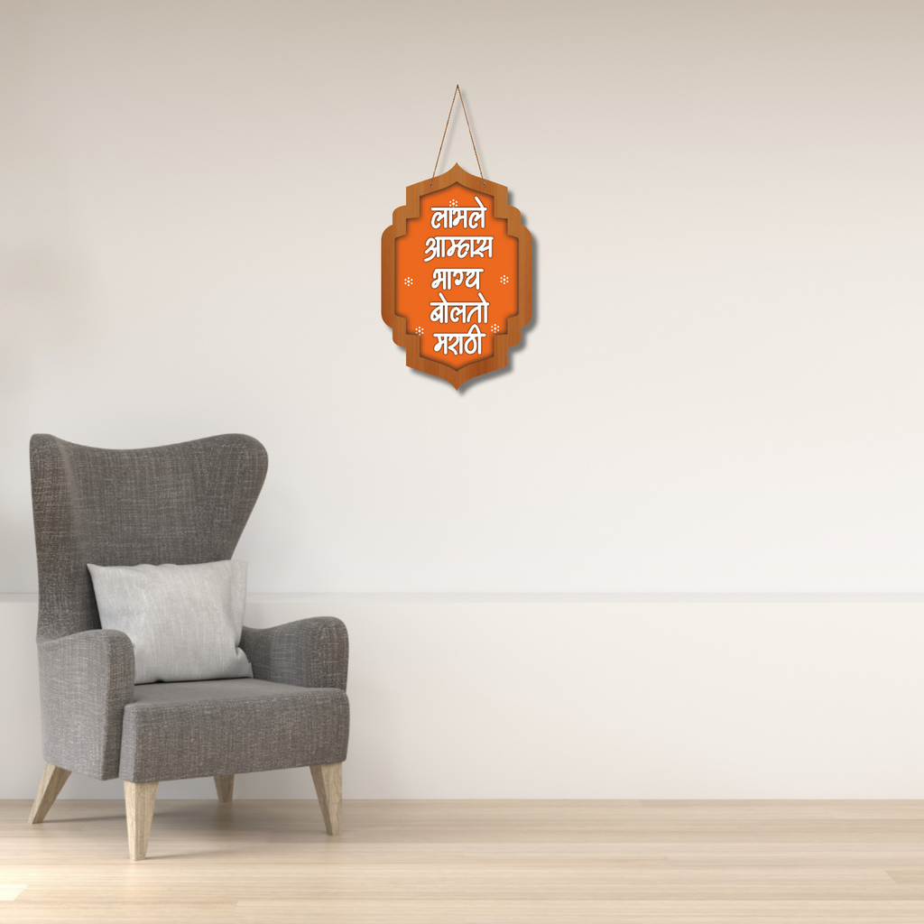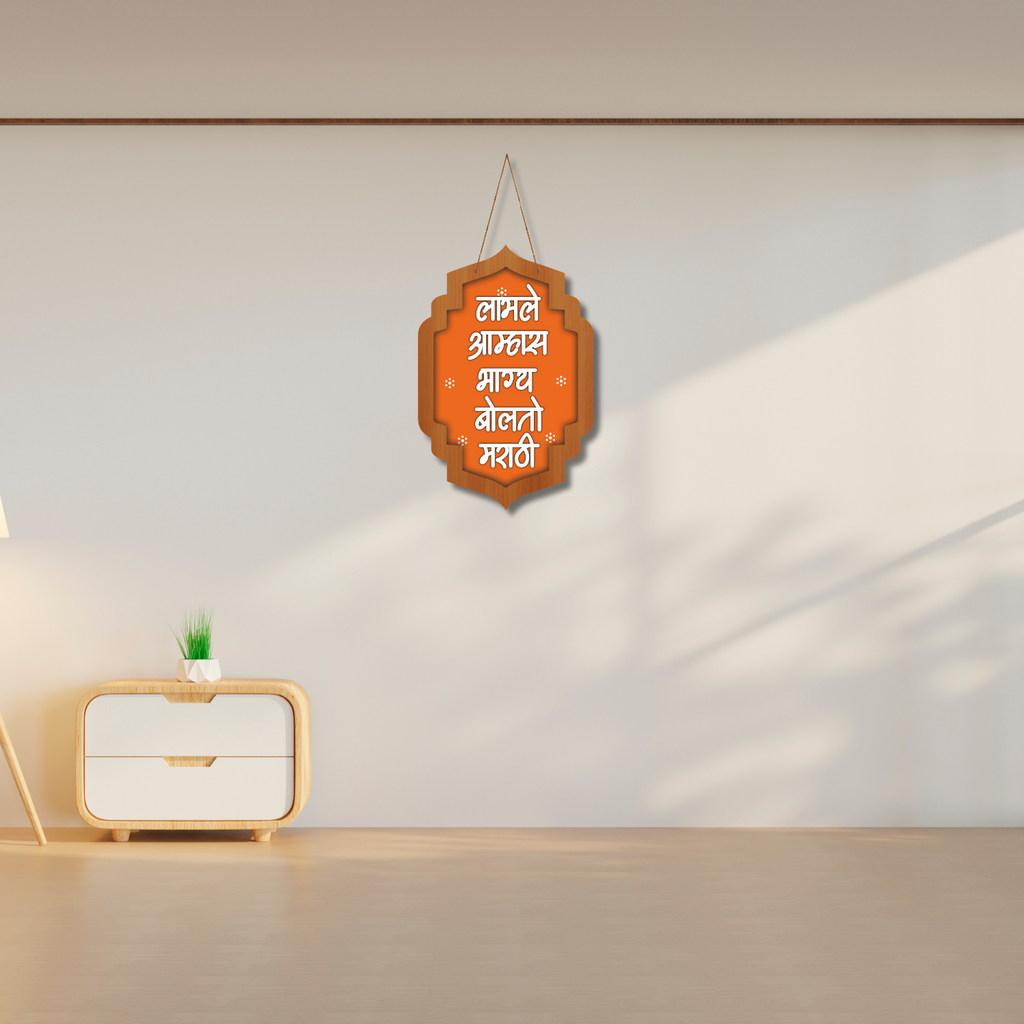 "लाभले आम्हास भाग्य बोलतो मराठी"Set in a striking saffron-orange background with elegant white Devanagari script, the frame features a rich wooden border in a classic Maharashtrian arch-style cutout, symbolizing heritage and identity.
