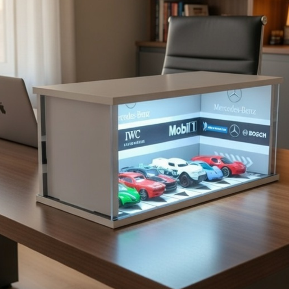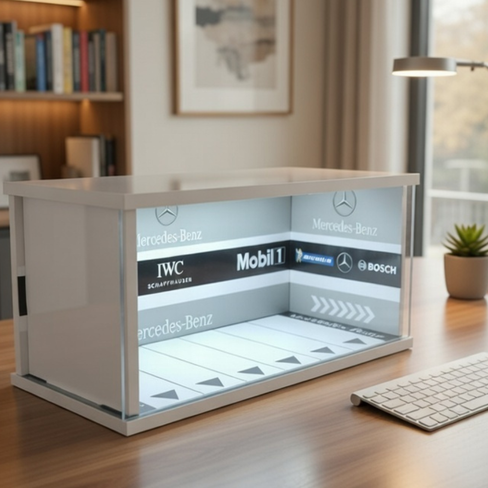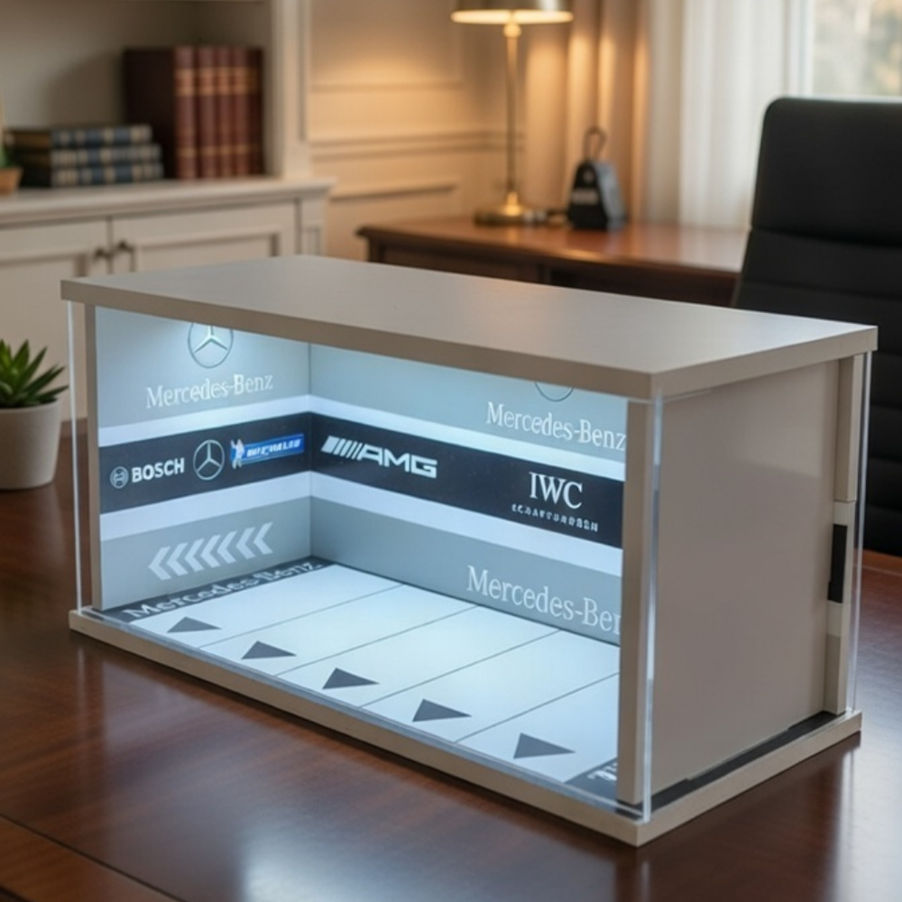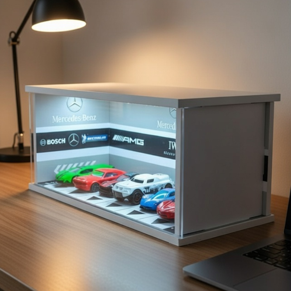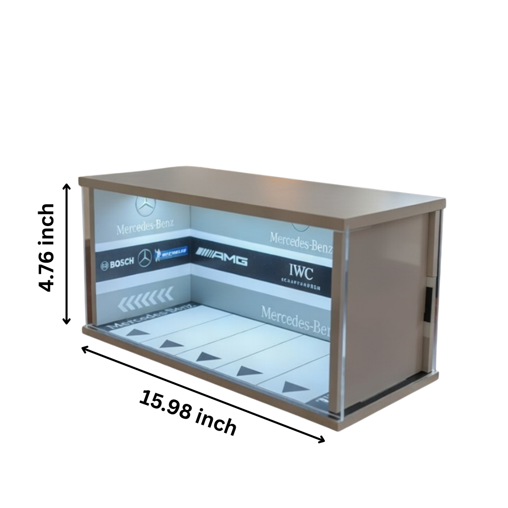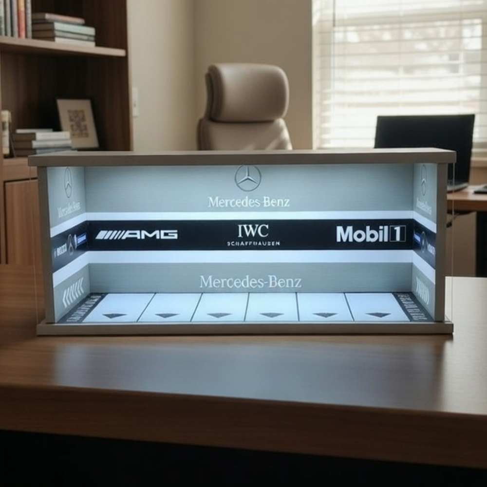 The Mercedes-Benz Luxury Car Diorama is a refined, LED-lit display crafted for collectors who appreciate elegance and performance. Inspired by premium motorsport branding, it features a clean monochrome palette, precision graphics, and soft ambient lighting that highlights every model car. The balanced layout and crisp parking lines create a calm, showroom-grade presence—perfect for desks, shelves, and cabinets. 🚘🤍