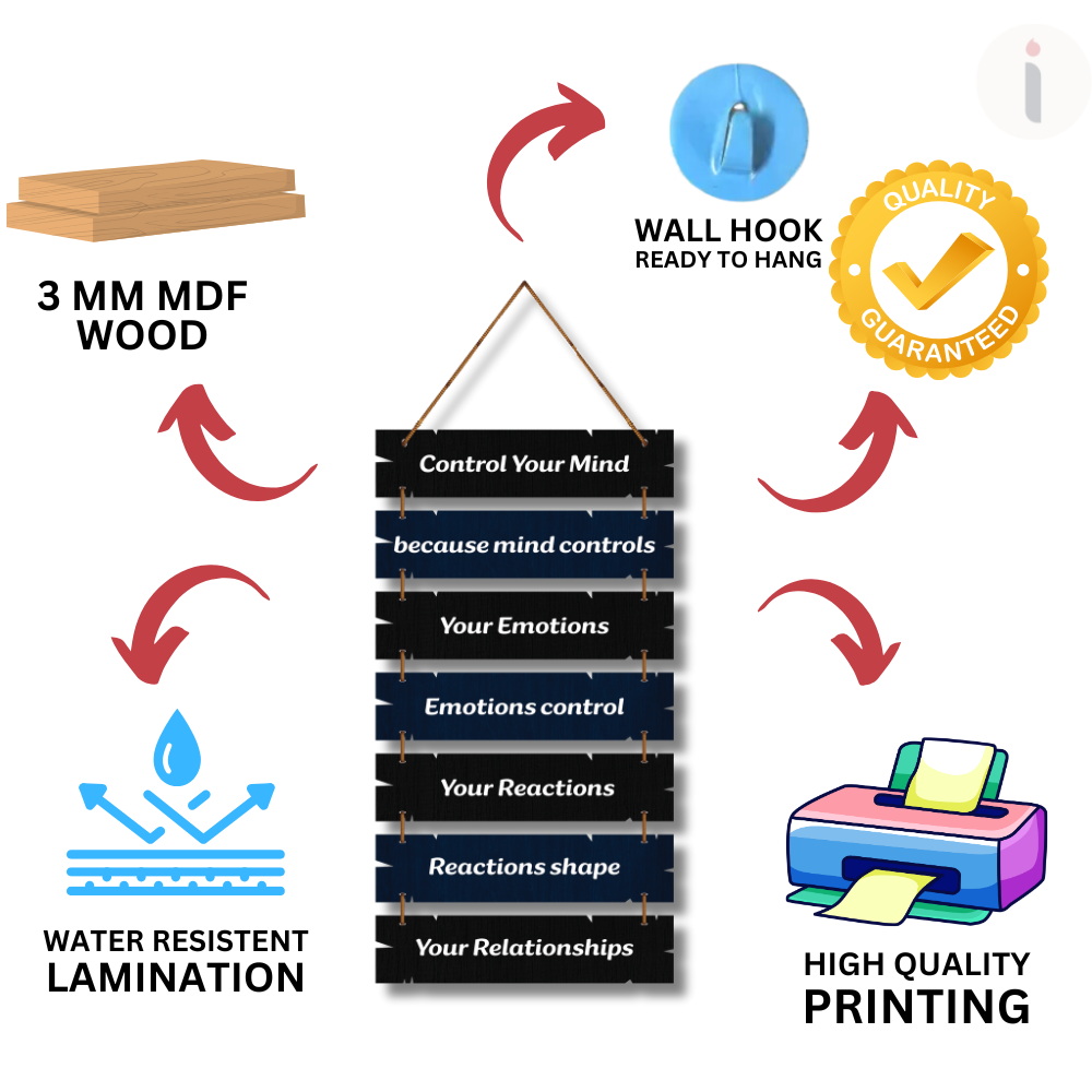 Upgrade your wall décor with wisdom and motivation using this Mind Control Flow Wooden Wall Hanging 🧠✨. Its powerful step-by-step message reminds you that your mind shapes emotions, reactions, and relationships 💡💬. Perfect for offices, study rooms, meditation corners, and self-growth spaces 🏡📚 — a daily reminder to stay mindful, balanced, and in control of your journey 🌿💪.