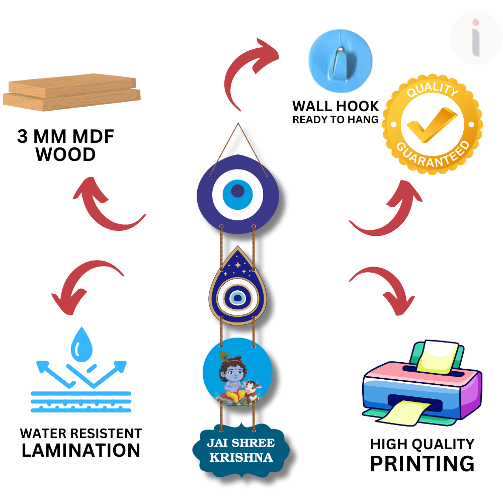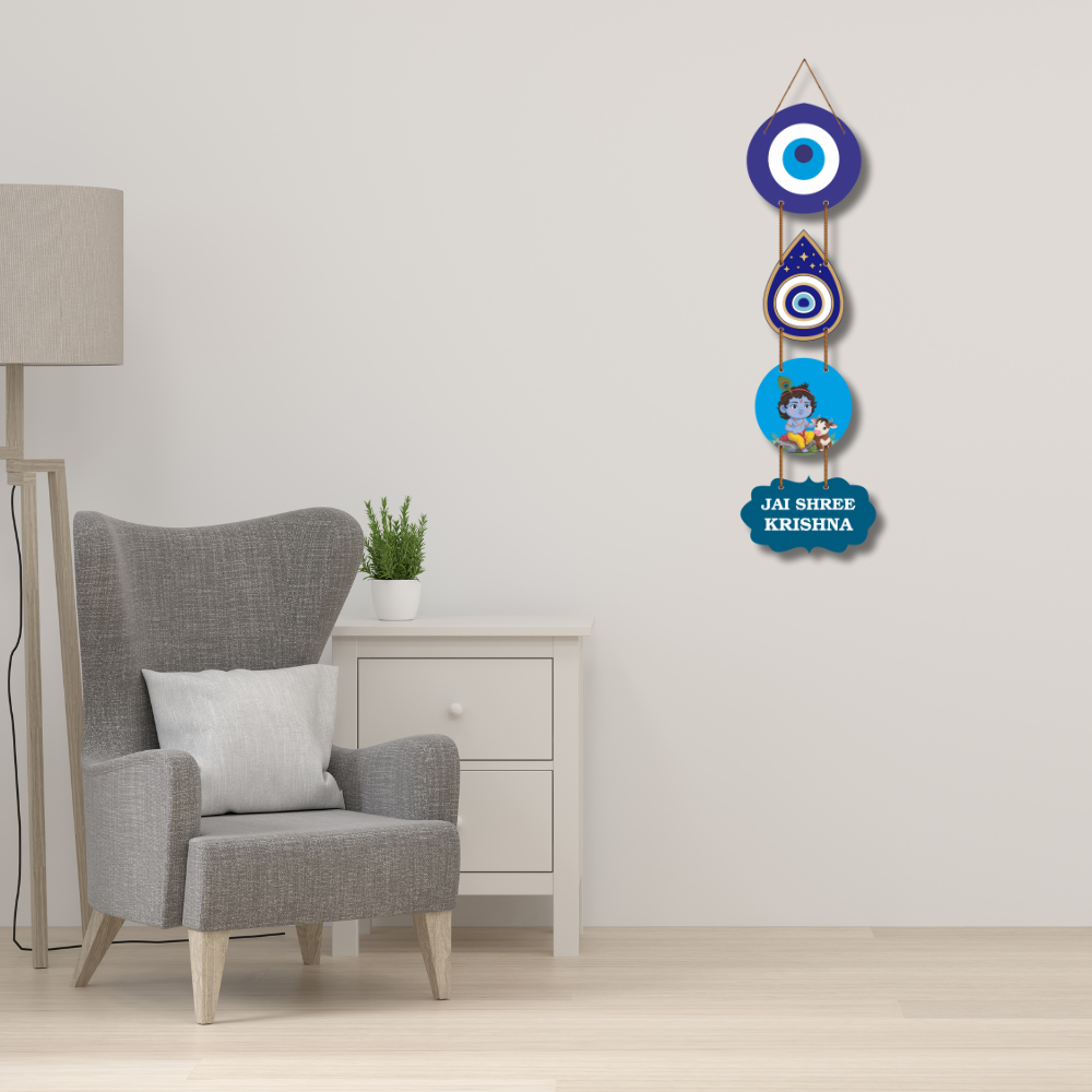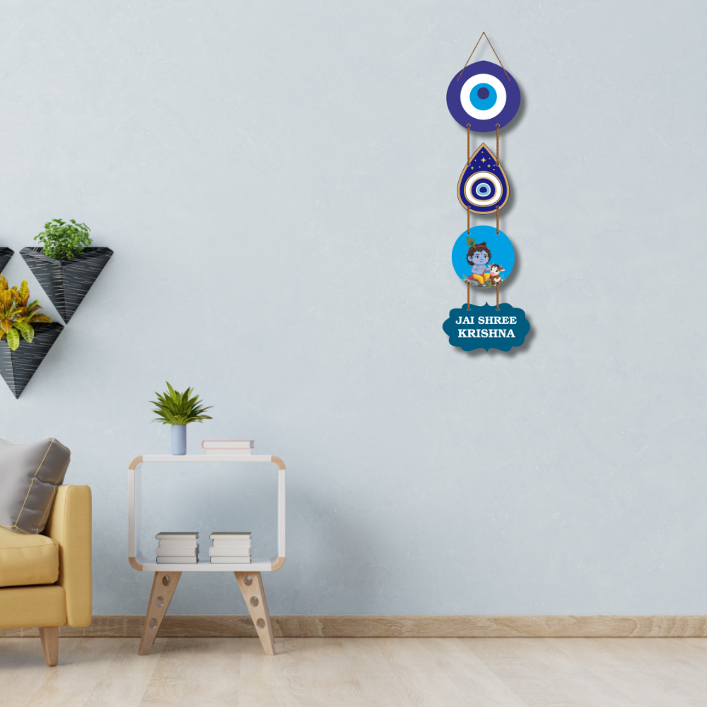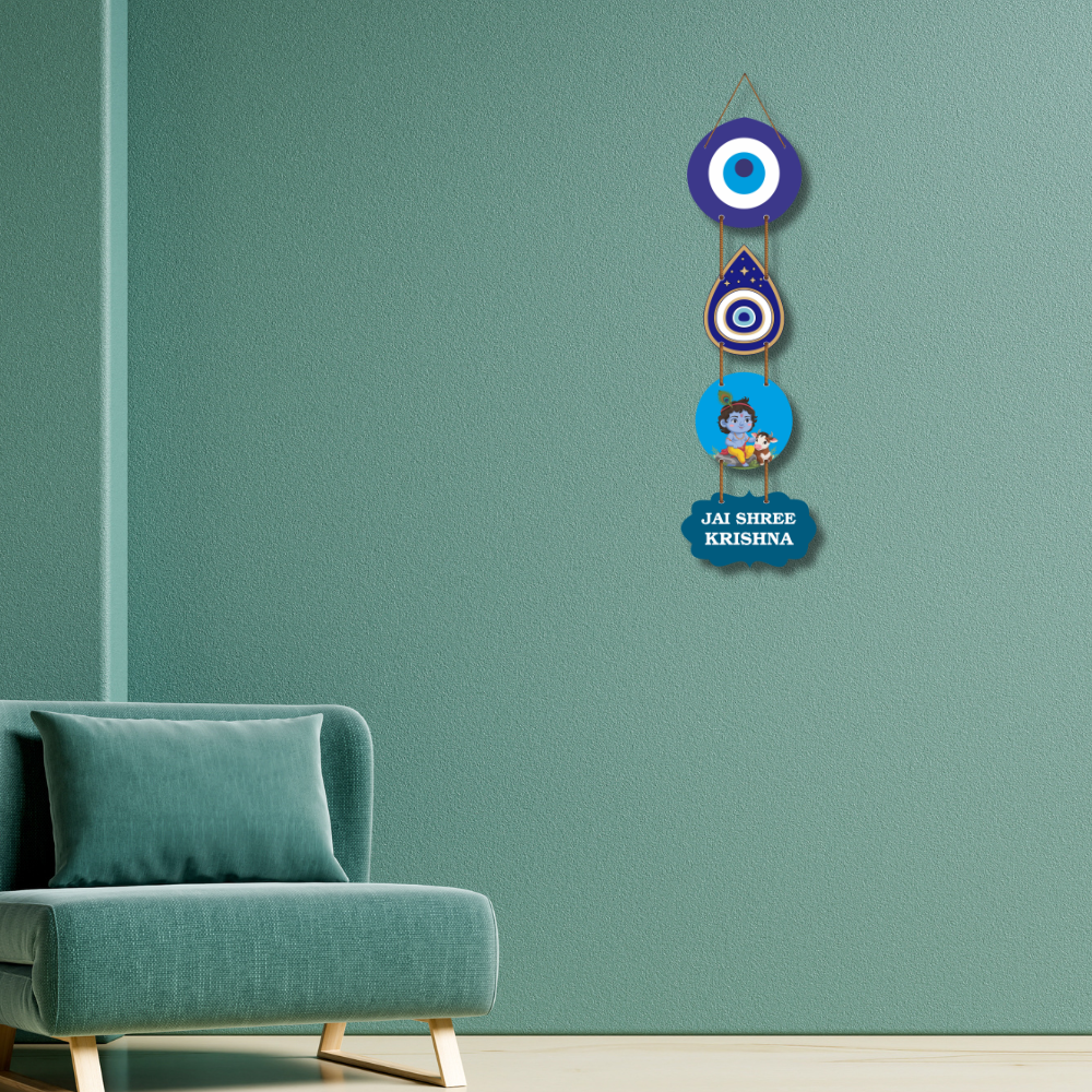 This beautiful wall hanging combines divine blessings with protective charm. Featuring Baby Krishna with his innocent smile and the sacred text “Jai Shree Krishna,” it is adorned with the traditional Nazar Battu (evil eye) design to ward off negativity. A perfect blend of spirituality and protection, this piece enhances positivity, peace, and devotion in your home décor.
