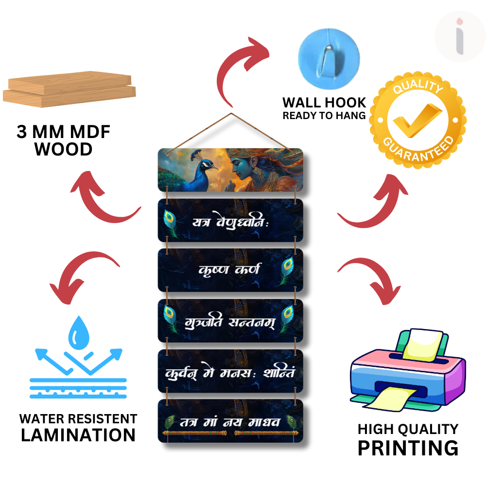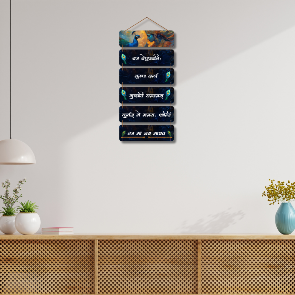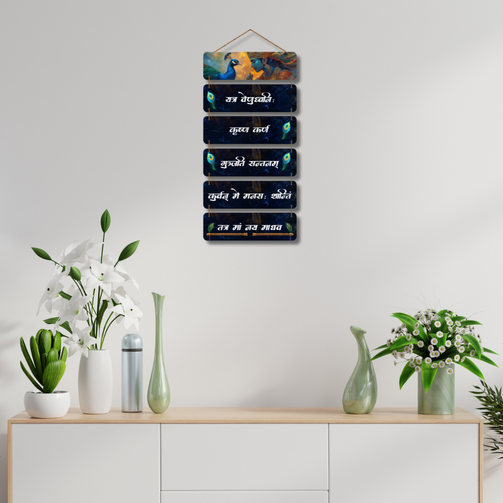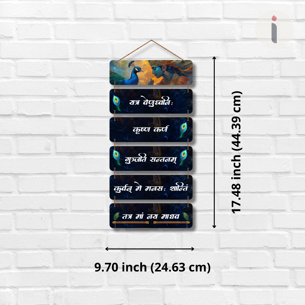 This beautiful wall hanging features Lord Krishna with peacock motifs and sacred Sanskrit verses, radiating peace and devotion. The intricate design and divine chants create a spiritual aura, perfect for meditation spaces, temples, or home décor. It symbolizes love, wisdom, and inner calm, making it a serene addition to your surroundings and a thoughtful gift for devotees.