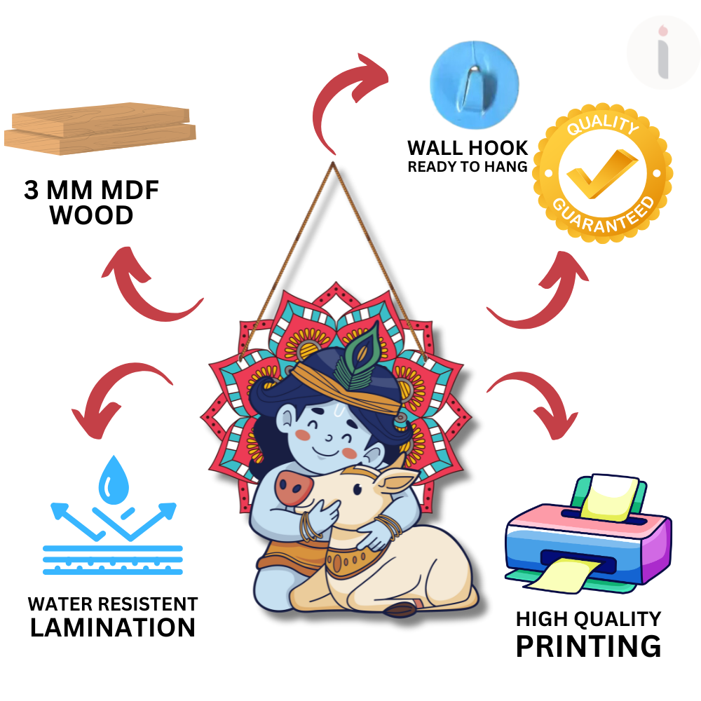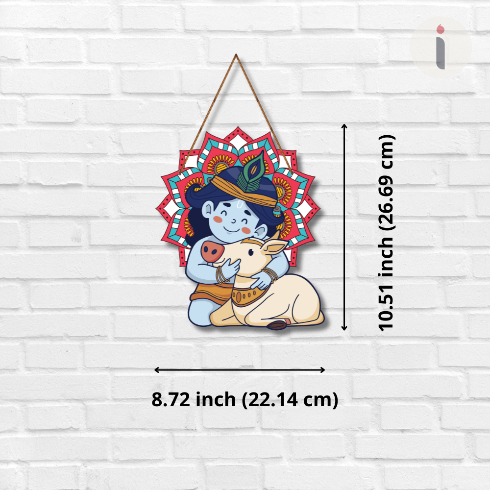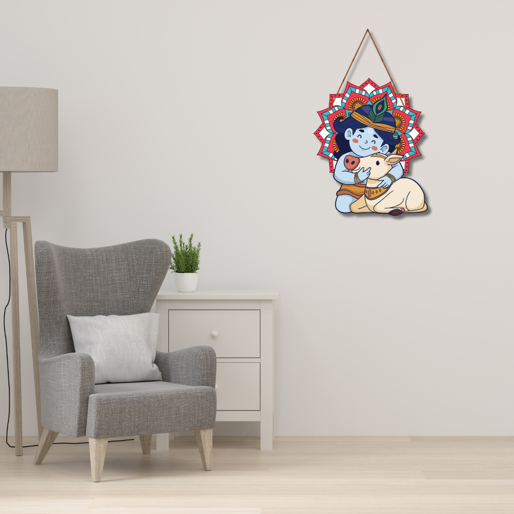 Bring home divine innocence and love with this adorable wall hanging of Bal Krishna hugging a cow. The vibrant mandala backdrop enhances its charm, symbolizing purity, protection, and devotion. Perfect for kids’ rooms, living spaces, or as a spiritual gift, this piece radiates positivity, joy, and the eternal bond of Lord Krishna with his beloved cow.