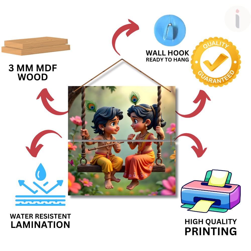 This beautiful wall hanging captures the innocence and divine charm of little Krishna and Radha enjoying a swing together amidst blooming flowers. With vibrant colors and intricate detailing, it symbolizes pure love, joy, and devotion. Perfect for adding a touch of spirituality and positivity, this artwork brings divine warmth to your living room, temple space, or gifting collection.