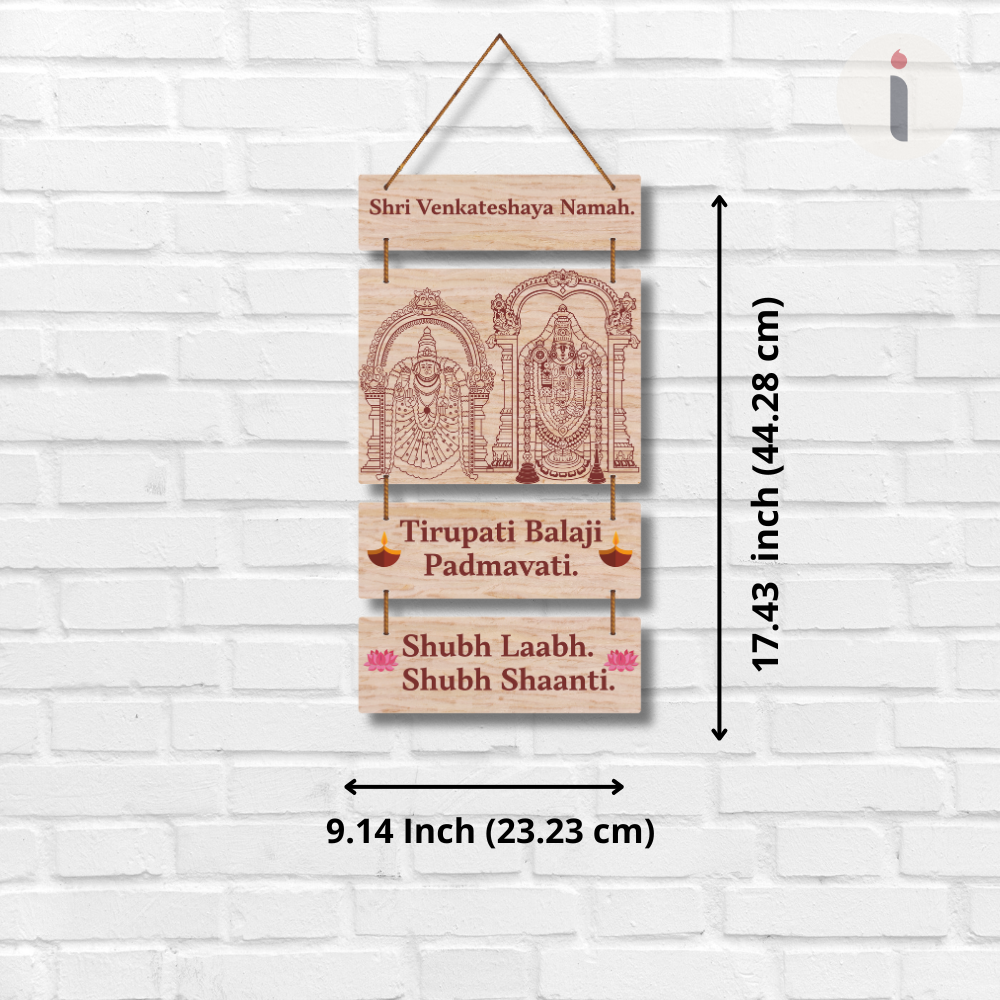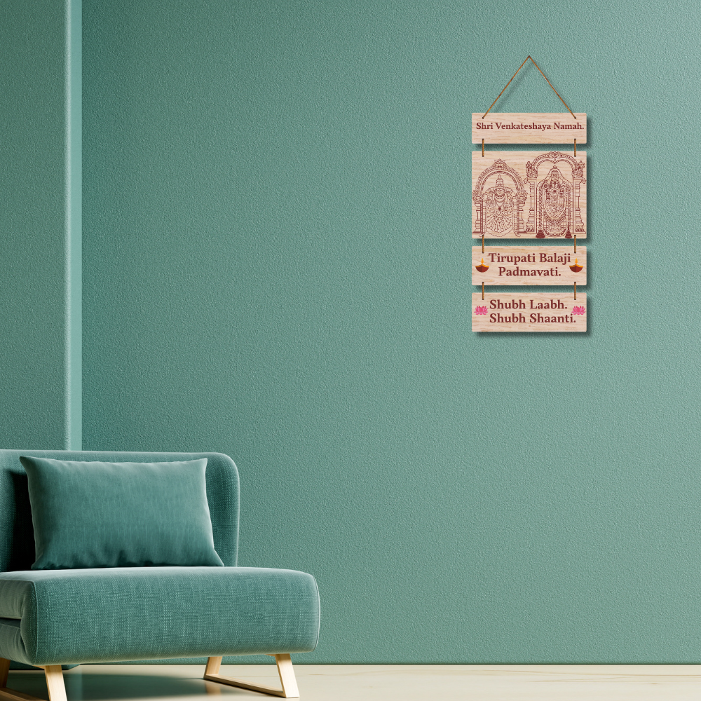 Invite prosperity and peace into your home with this sacred Tirupati Balaji and Padmavati wooden wall hanging. Engraved with the mantra “Shri Venkateshaya Namah” and blessings of “Shubh Laabh, Shubh Shaanti”, it radiates divine energy. Perfect for pooja rooms, meditation spaces, or gifting, this décor brings spiritual grace and auspicious vibes to every household.