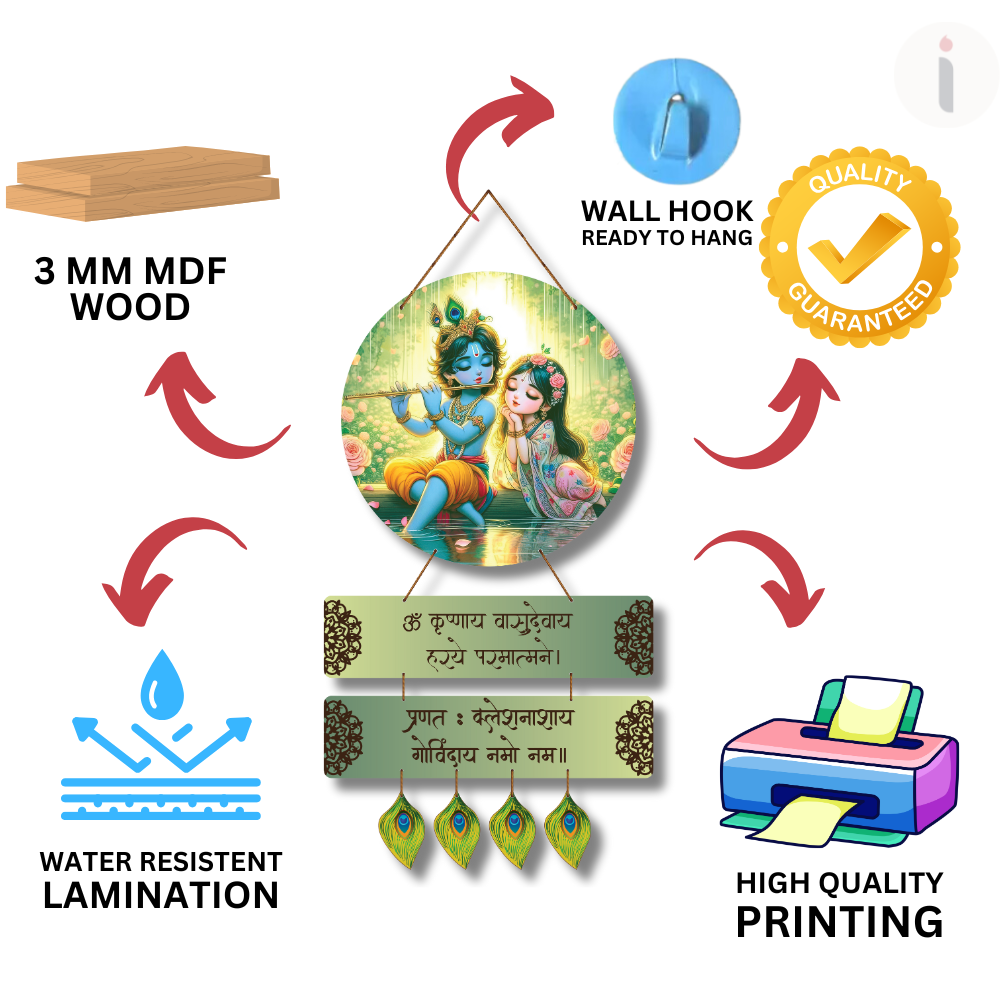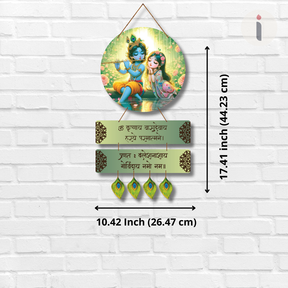 Celebrate eternal love and devotion with this beautiful wall hanging of Radha and Krishna, adorned with sacred Sanskrit mantras and peacock feather motifs. The serene artwork reflects harmony, spirituality, and divine bliss, making it ideal for living rooms, meditation spaces, or gifting. This décor piece radiates positivity, peace, and the timeless charm of Shri Radha Krishna’s bond.