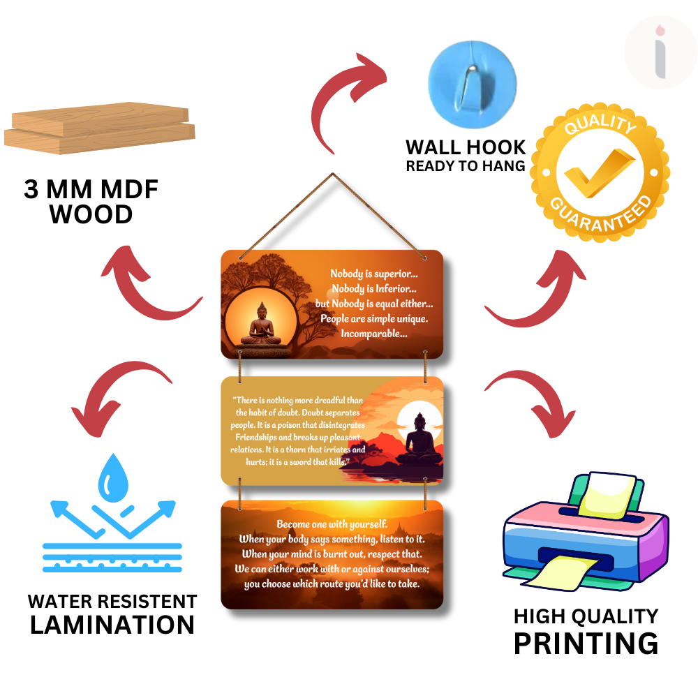 Inspire mindfulness and inner peace with this serene wall hanging featuring powerful Buddha quotes about self-realization, doubt, and balance. Designed with calming sunset backdrops and meditating Buddha art, it encourages positivity, wisdom, and self-awareness. Perfect for meditation rooms, offices, or home décor, this piece spreads tranquility and motivation, reminding us to embrace peace and harmony within.