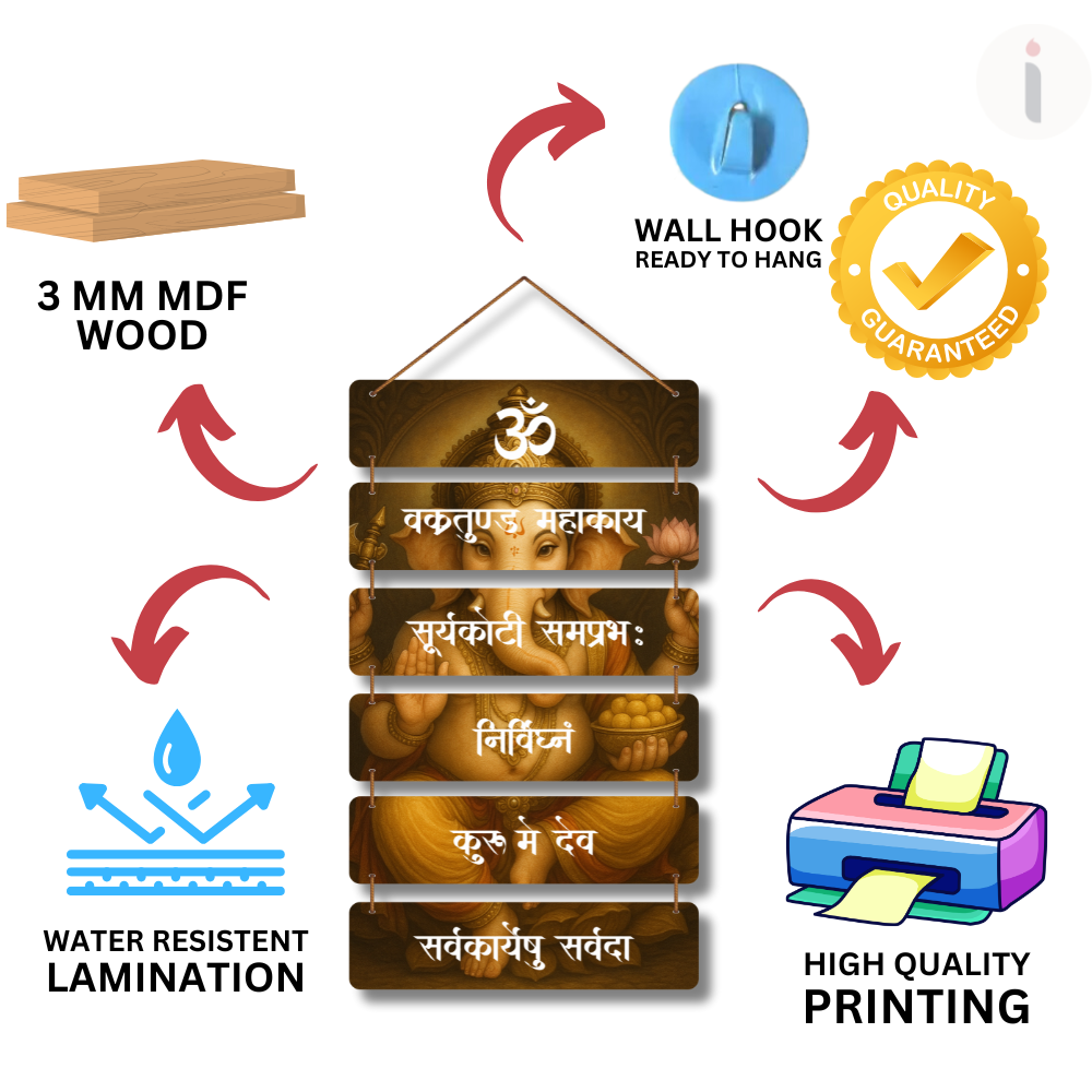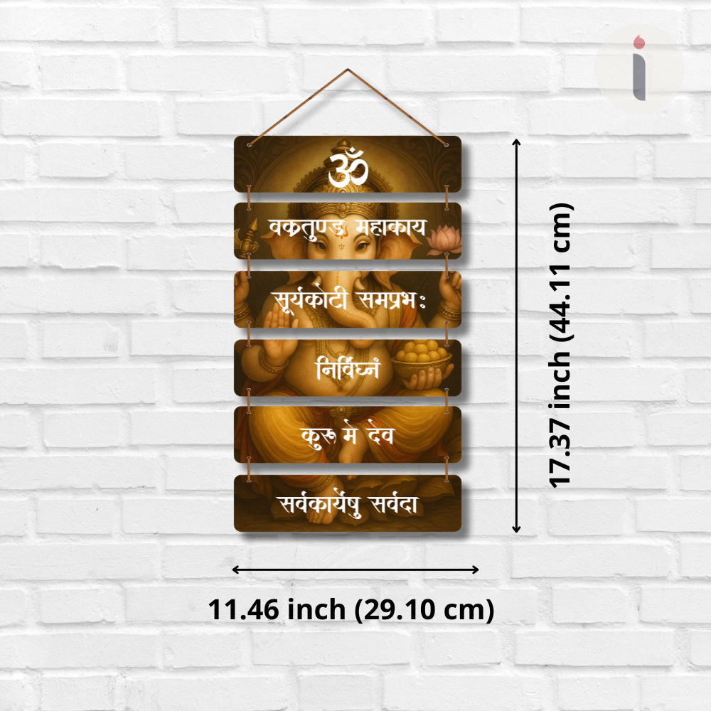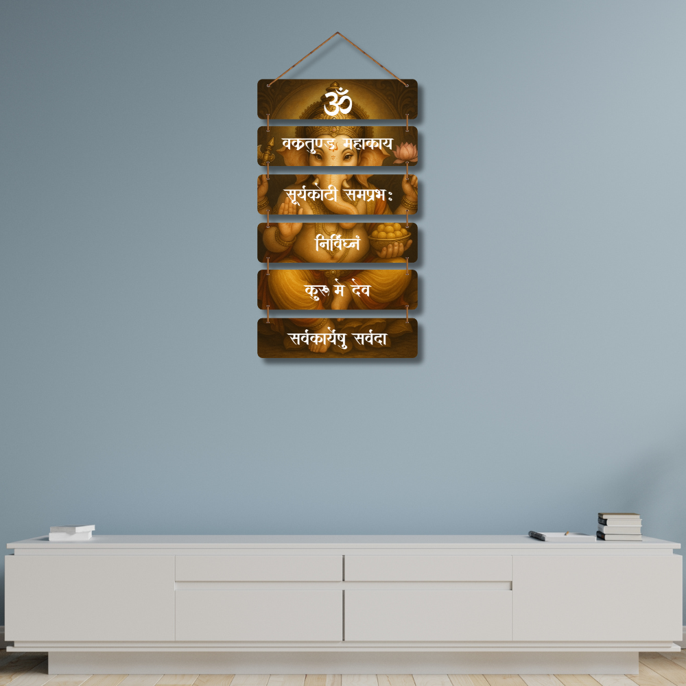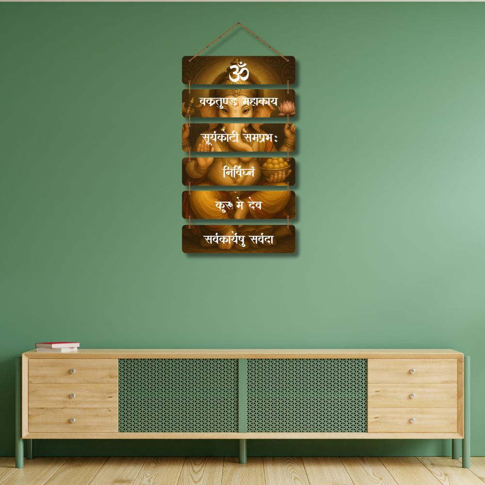 Invite divine blessings with this elegant wall hanging of Lord Ganesha adorned with the sacred mantra “Vakratunda Mahakaya.” The detailed artwork and soothing design symbolize wisdom, prosperity, and new beginnings. Perfect for homes, offices, or temples, this décor piece spreads positivity, removes obstacles, and creates a serene spiritual ambiance, making it a thoughtful and auspicious gift too.