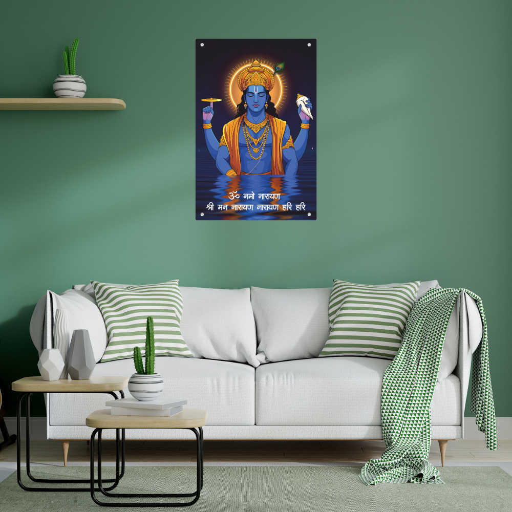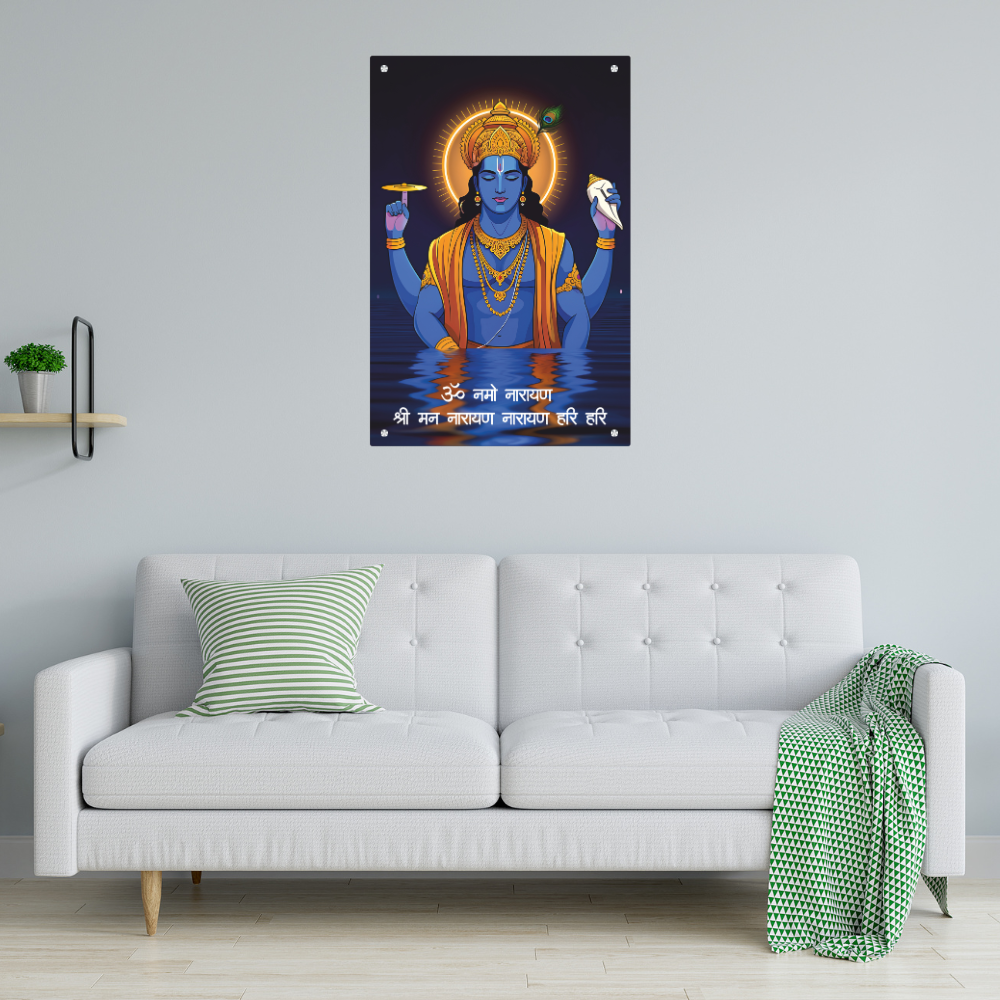Adorn your space with the serene and powerful presence of Lord Vishnu, the preserver of the universe, depicted in a divine form holding the Sudarshan Chakra and Shankh. Featuring the sacred mantra –