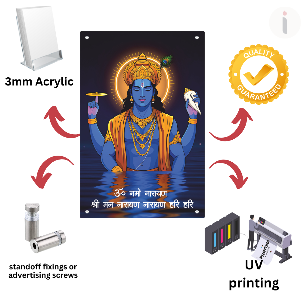 Design Theme: Lord Narayan in meditative water reflection style with mantra text