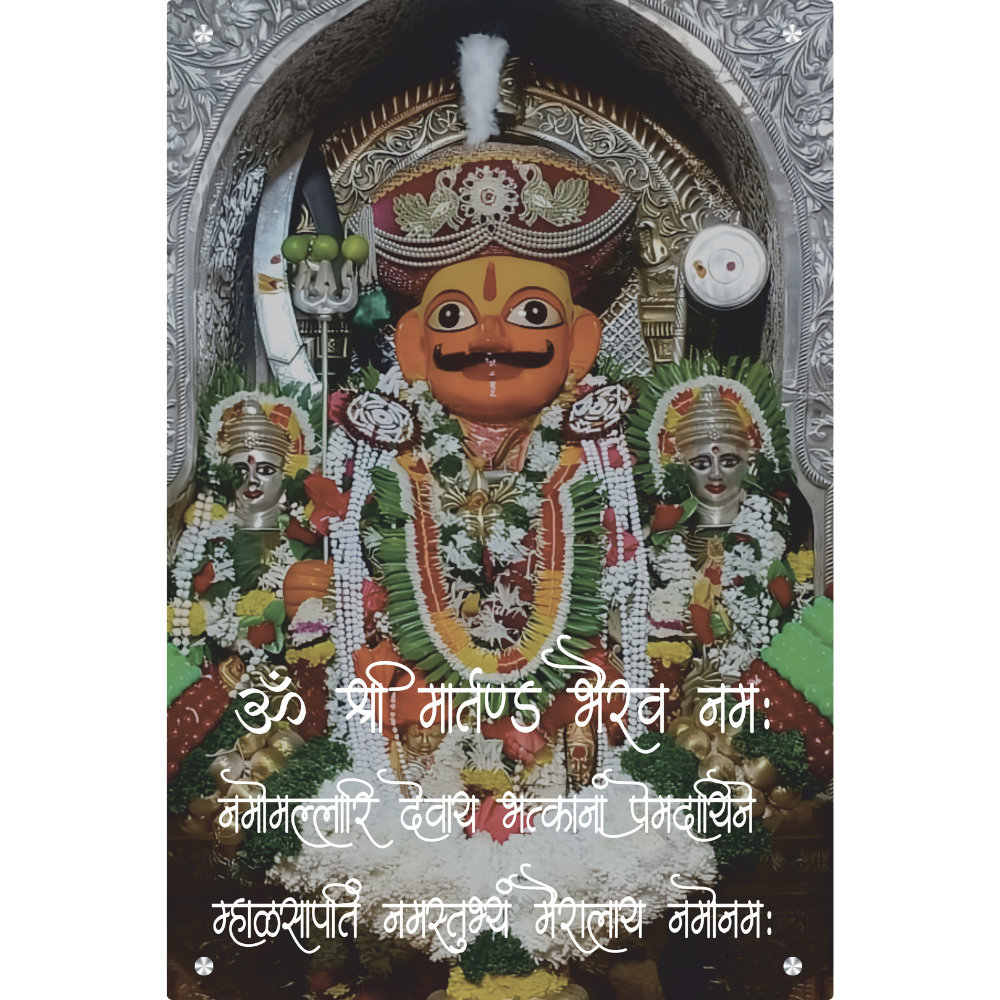 Invoke the fierce yet protective energy of Lord Martanda Bhairav, a powerful form of Lord Shiva, with this spiritually charged acrylic wall frame. Featuring the sacred mantra "ॐ श्री मार्तंड भैरव नमः", this artwork radiates divine power, protection, and spiritual awakening. Printed using advanced UV technology on 3mm premium glossy acrylic, it offers vibrant color clarity and exceptional durability. Comes with decorative standoff fixings (advertising screws) for a modern, elegant wall display.