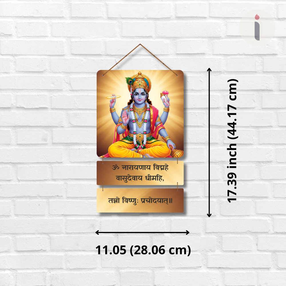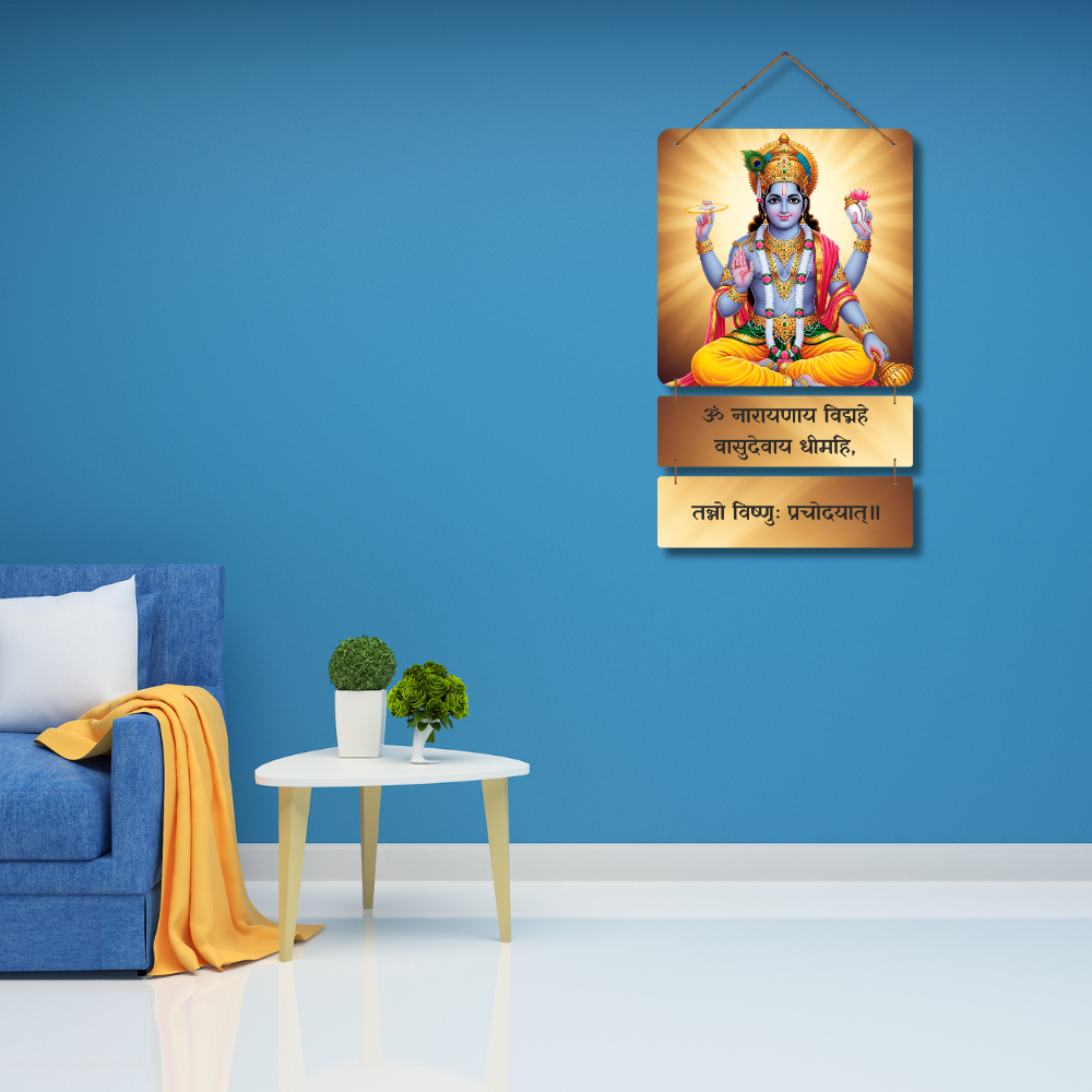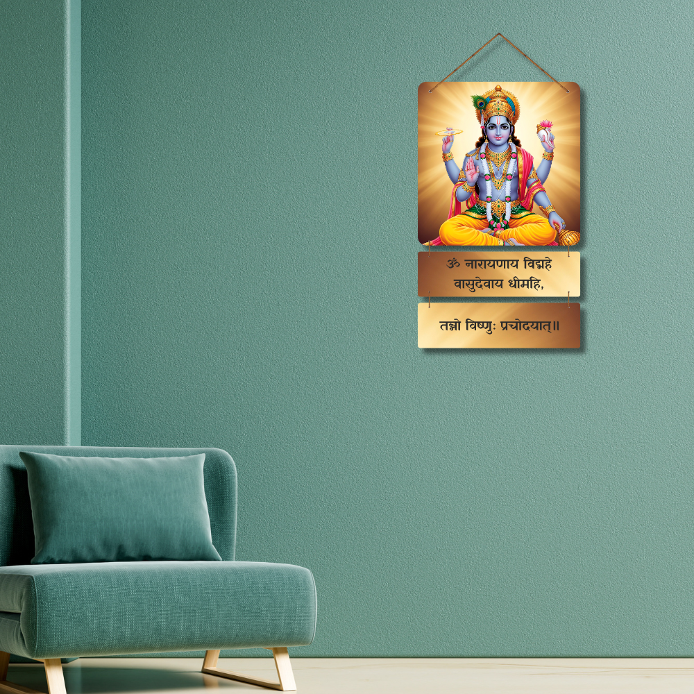 Invite divine blessings, peace, and prosperity into your home with this Om Narayanaya Vidmahe Wooden Wall Hanging 🕉️🦚. Featuring a vibrant picture of Lord Narayana and the sacred Vishnu Gayatri Mantra, it fills your space with positivity, faith, and spiritual energy ✨🙏. Perfect for temple corners, meditation rooms, entrances, and gifting 🎁🏡 — a devotional décor piece for every Vishnu devotee.
