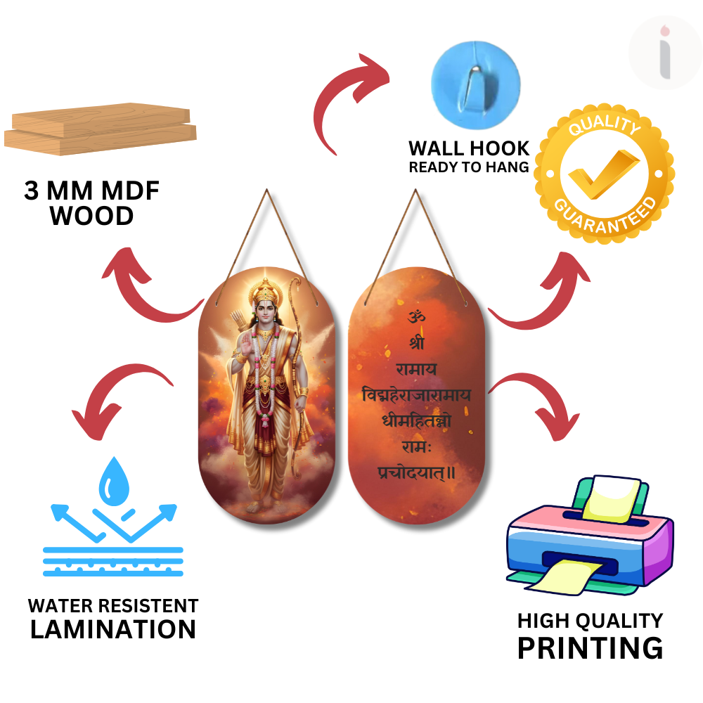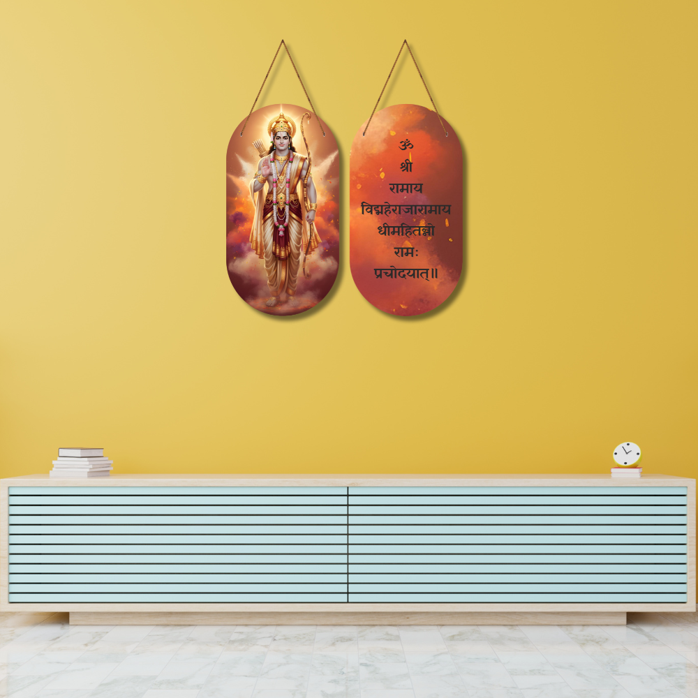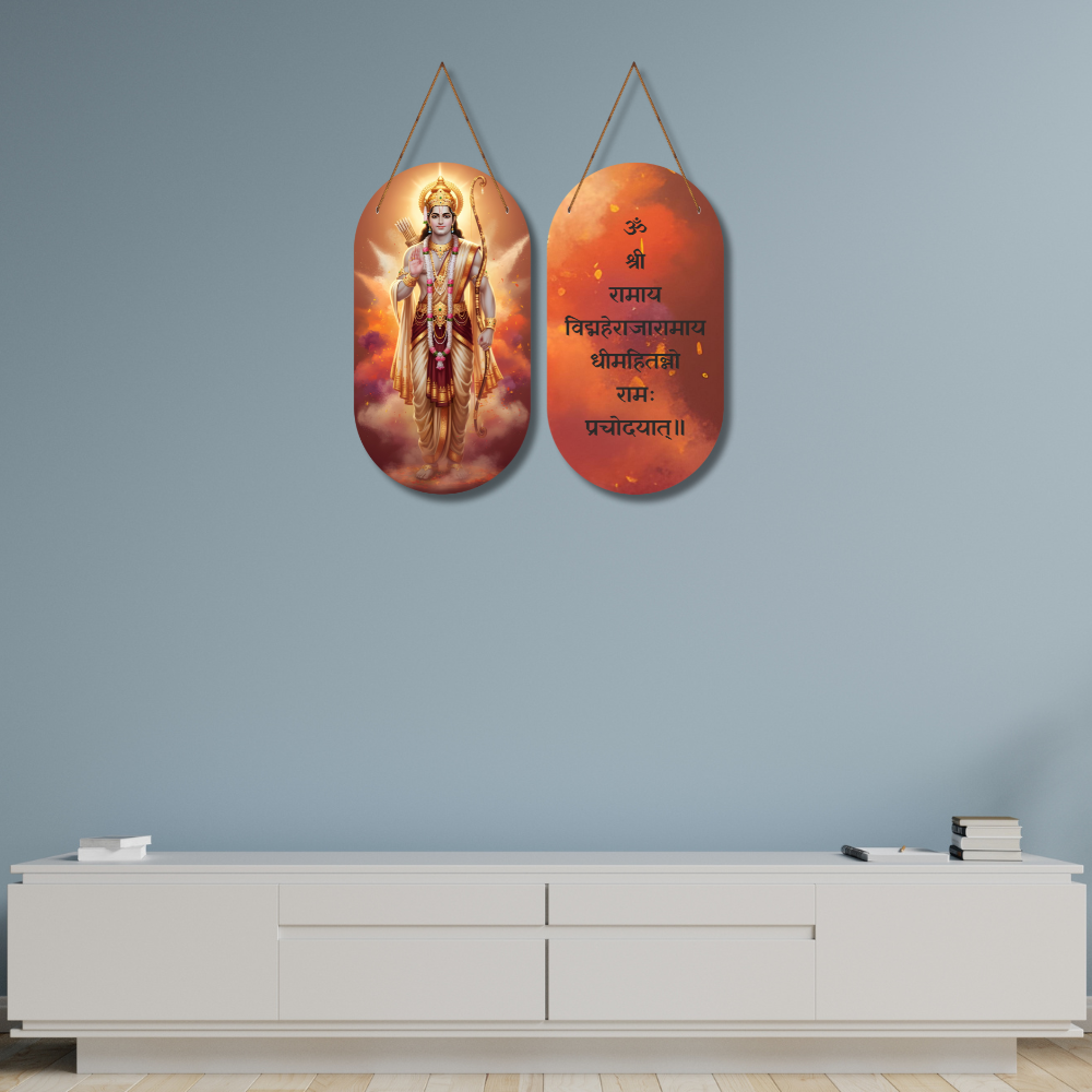 🚩 Embrace divine energy with this elegant double-sided Lord Ram wall hanging! ✨ One side displays a radiant image of Shri Ram, while the other features the sacred Ram Gayatri Mantra – “ॐ श्री रामाय… प्रचोदयात्।” 🌼 Perfect for pooja rooms, entrances, meditation corners, offices or gifting spiritual blessings. 🙏 Let Ram’s grace protect, guide, and inspire your home every day.
