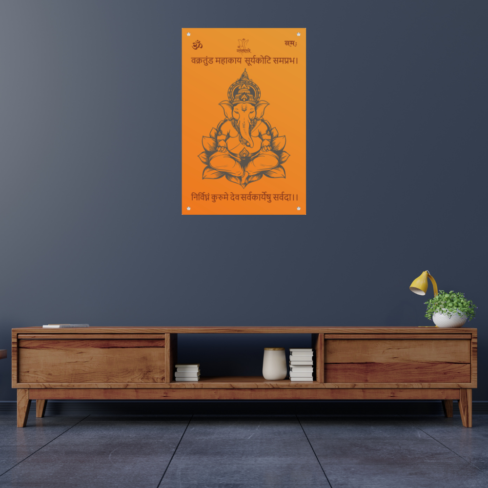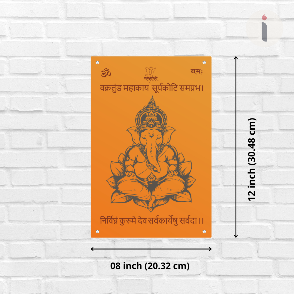 This striking design features Lord Ganesh seated on a lotus, outlined in a minimalistic style on a vibrant saffron-orange background. Made with 3mm glossy acrylic, printed using UV technology for brilliant, fade-resistant colors. Includes standoff fixings (advertising screws) for a modern floating effect.