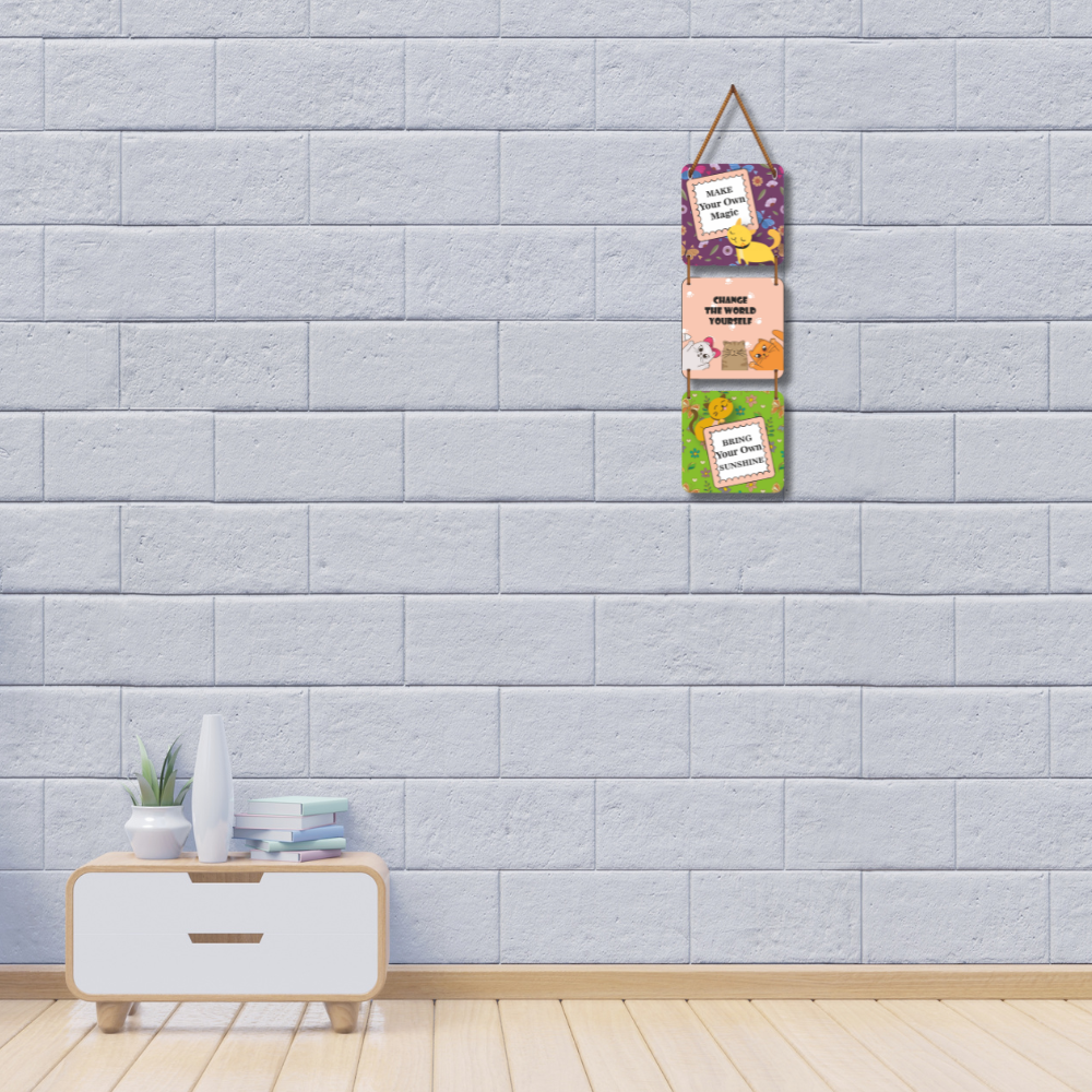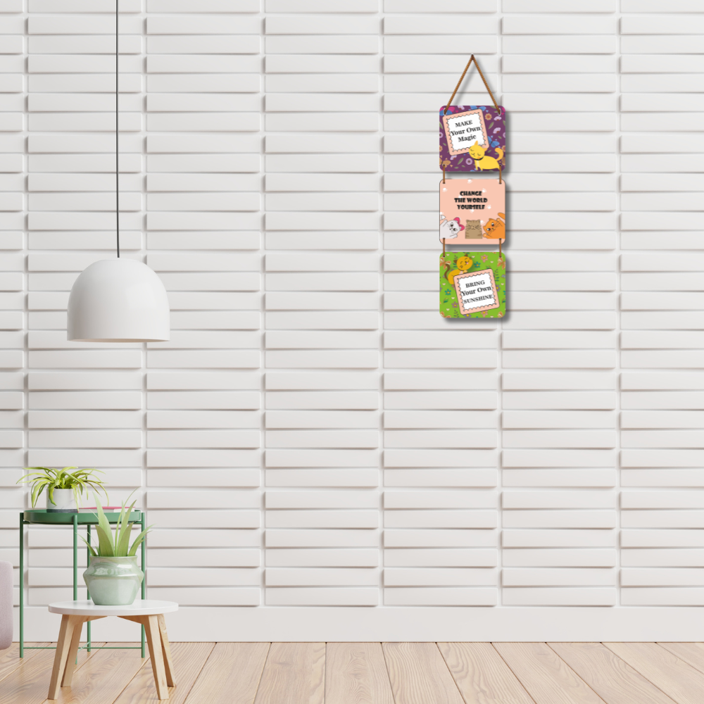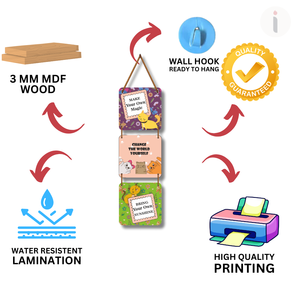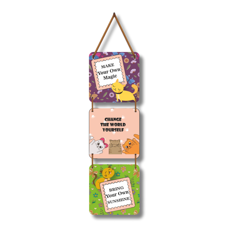 Brighten up your space with this playful cat-themed wall hanging, carrying uplifting messages like Make Your Own Magic, Change the World Yourself, and Bring Your Own Sunshine. Perfect for animal lovers, kids’ rooms, or cozy corners, it combines charm and motivation, reminding you to embrace positivity and create your own happiness every day.