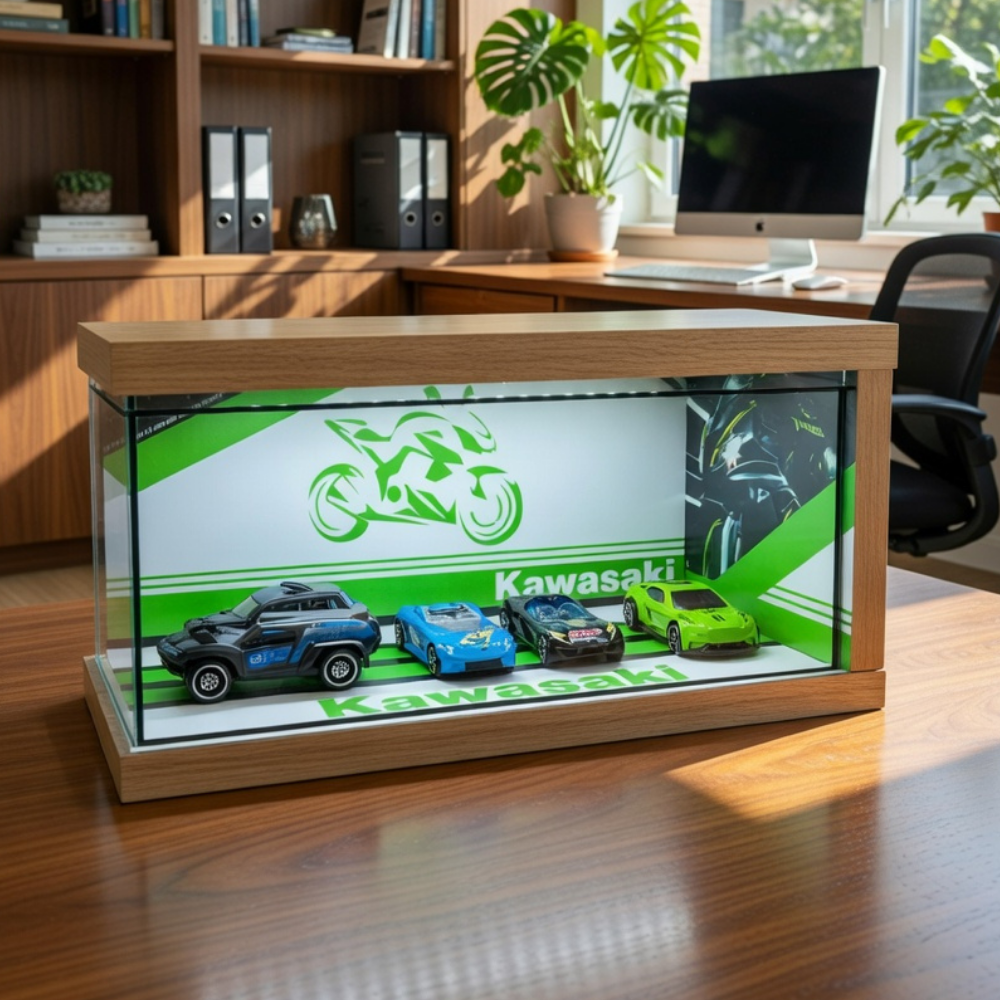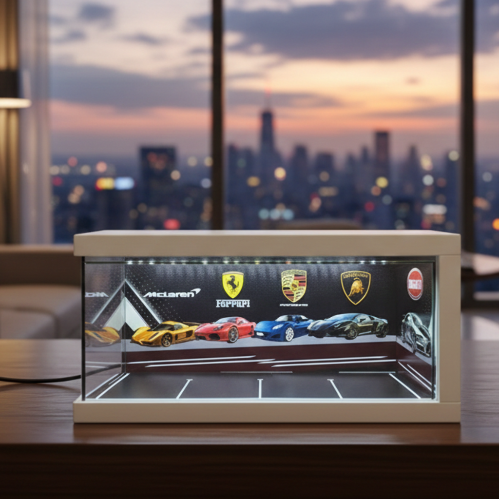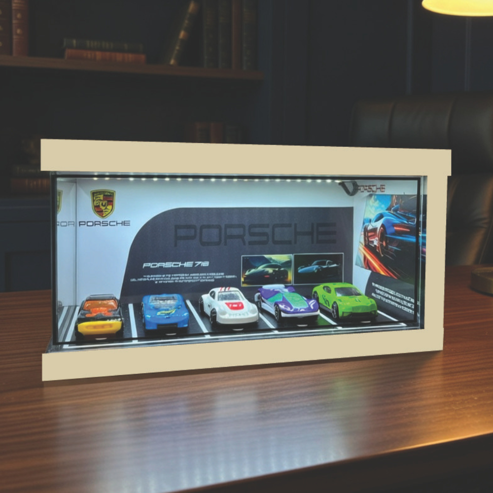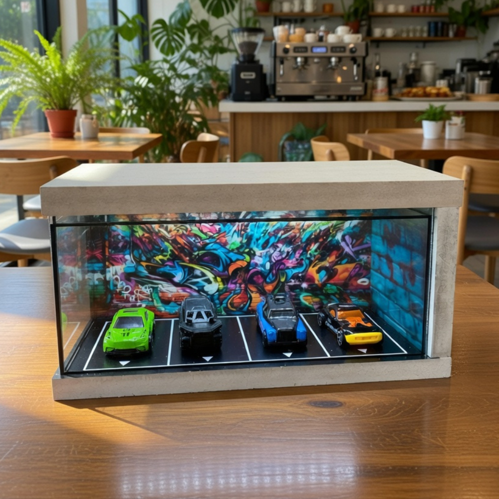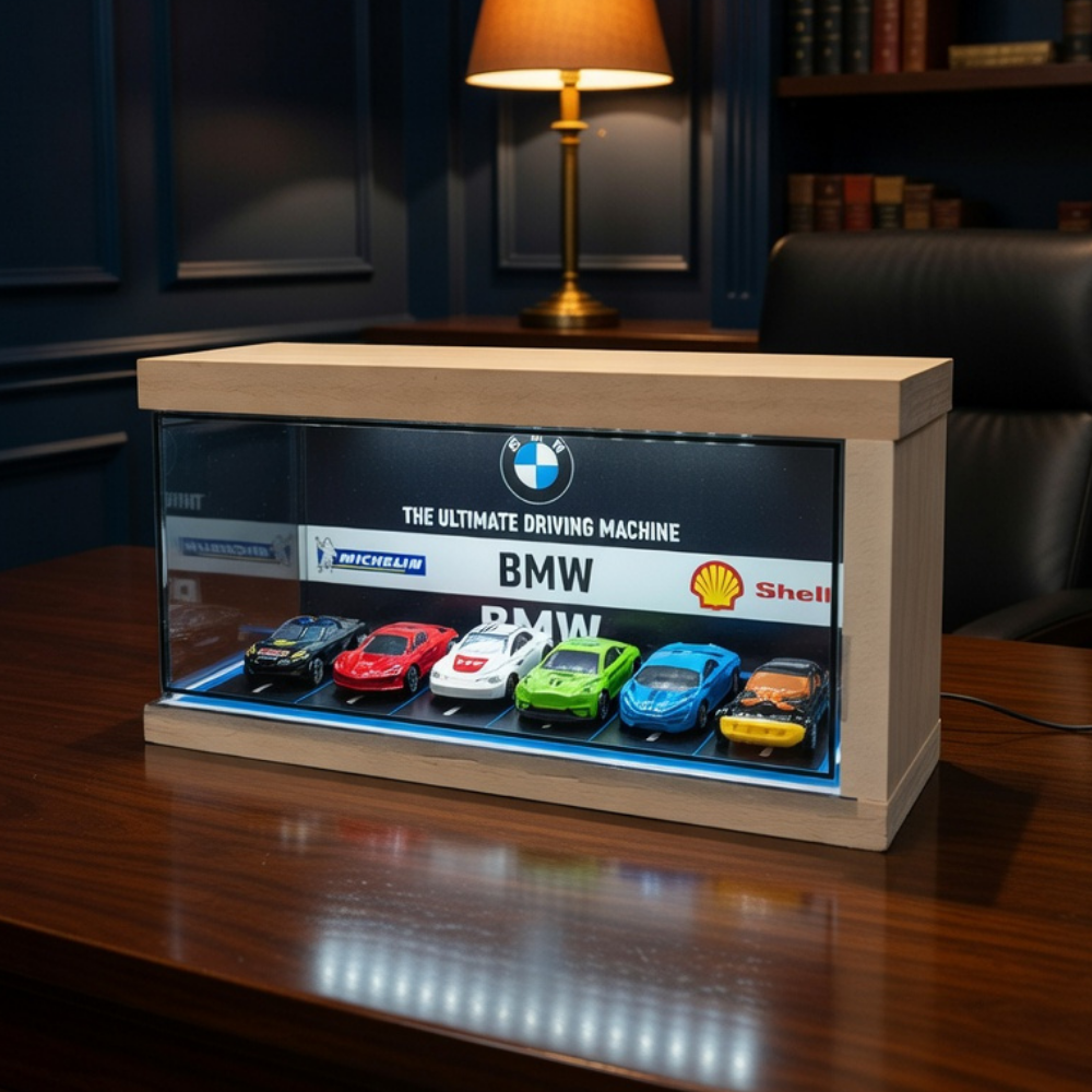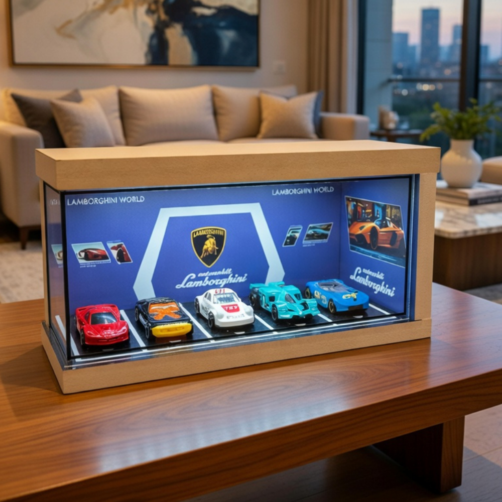Upgrade your diecast car collection with this premium Car Showroom Diorama 🏁, designed to give a realistic luxury showroom feel. Crafted with a strong wooden frame 🪵 and high-quality printed backdrop, this diorama features bright LED lighting 💡 that highlights every detail of your model cars. Perfect for car collectors, enthusiasts, and gifting 🎁, it turns any shelf or table into a mini showroom. Available in multiple showroom designs and themes, each variant adds a unique visual appeal to your home, office, or display counter.