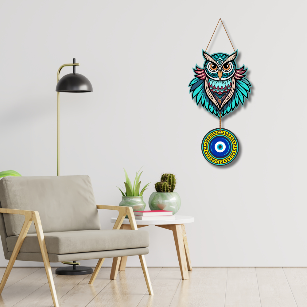 This stunning wall hanging combines the wisdom of the owl with the protective power of the evil eye symbol. Designed in vibrant shades of blue and intricate patterns, it brings both beauty and positivity to your space. Perfect for home or office décor, it wards off negative energy while adding an artistic, spiritual charm to your interiors.