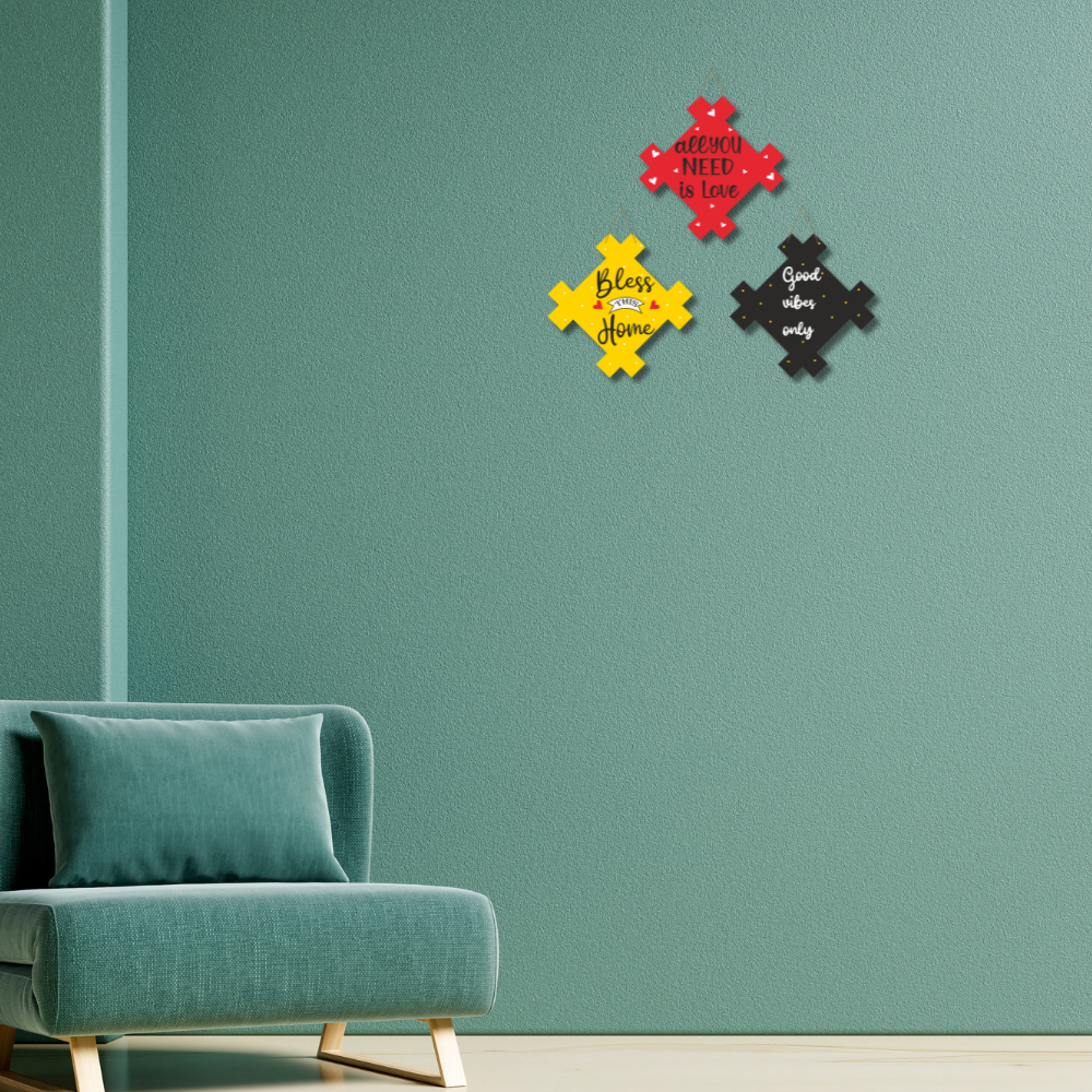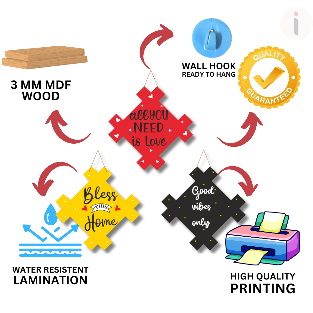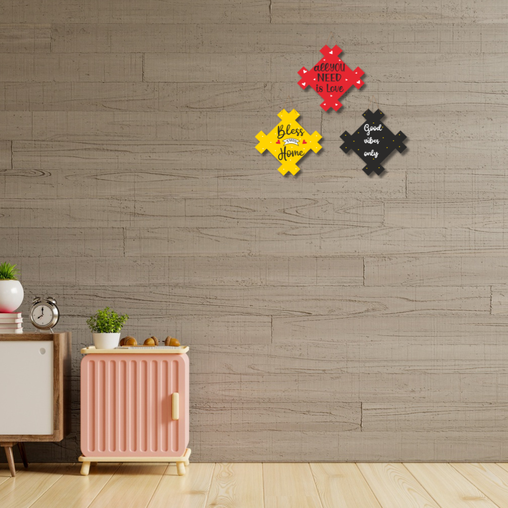 This vibrant trio of wall hangings spreads positivity and charm with bold messages – All You Need is Love, Bless This Home, and Good Vibes Only. Designed in striking red, yellow, and black with playful motifs, they add warmth and cheer to any space. Perfect for gifting or home décor, they inspire love, blessings, and positivity every day.