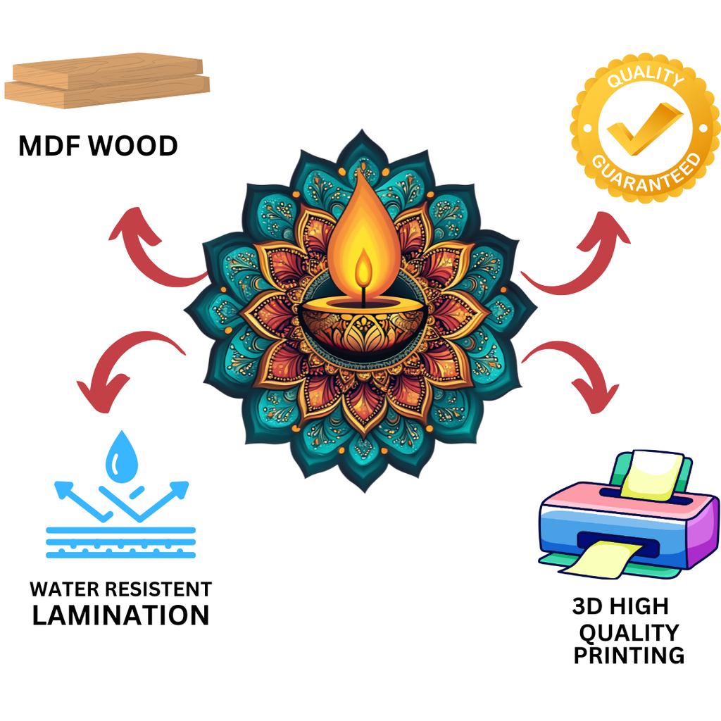 Illuminate your interiors with this elegant Eternal Diya Mandala Wall Hanging, designed to spread warmth, positivity, and festive charm 📸. Featuring a beautifully detailed diya centerpiece surrounded by artistic mandala petals, it brings a spiritual touch to living rooms, pooja spaces, meditation corners, and office walls 📸. Expertly crafted on premium MDF with a smooth matte finish, this décor piece is durable, scratch-resistant, and lightweight. Its 12x12 inches size adds a perfect visual balance without overpowering your wall setup 📸. Ideal for Diwali décor, gifting, and everyday ambiance upliftment.