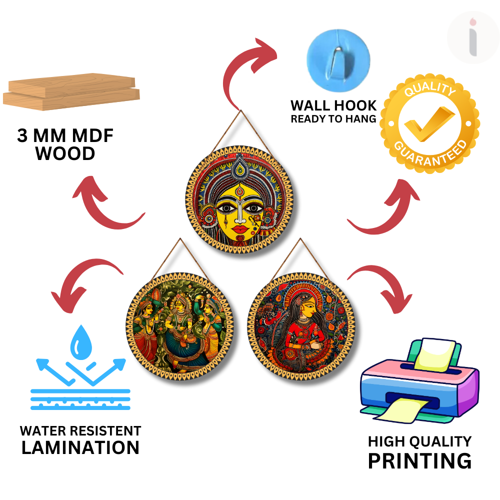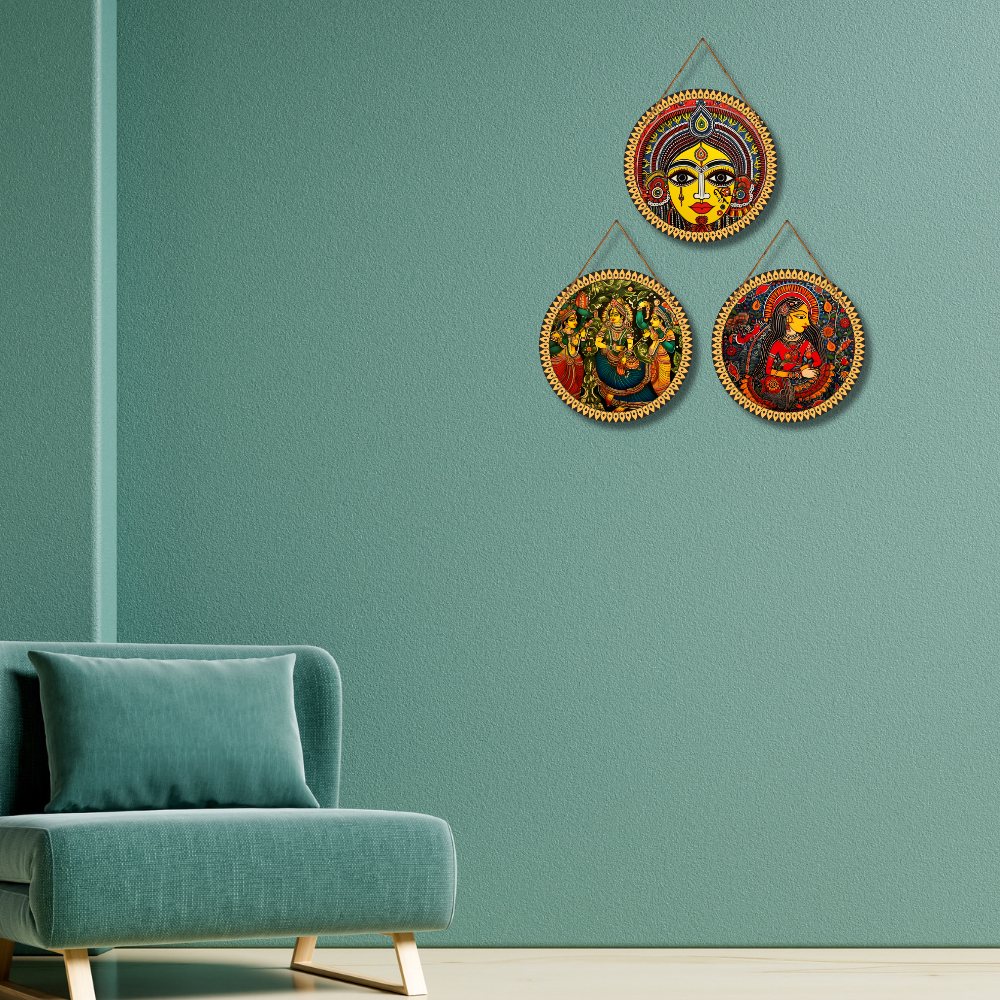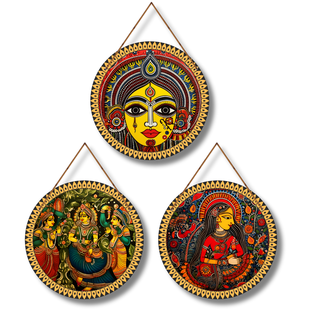 Enhance your interiors with this exquisite wall hanging set featuring vibrant Madhubani artwork. Showcasing goddess forms, folk tales, and graceful women, each piece is adorned with intricate detailing and bold colors that reflect India’s rich cultural heritage. Perfect for living rooms, art corners, or gifting, this set brings elegance, tradition, and timeless artistry to your home décor.