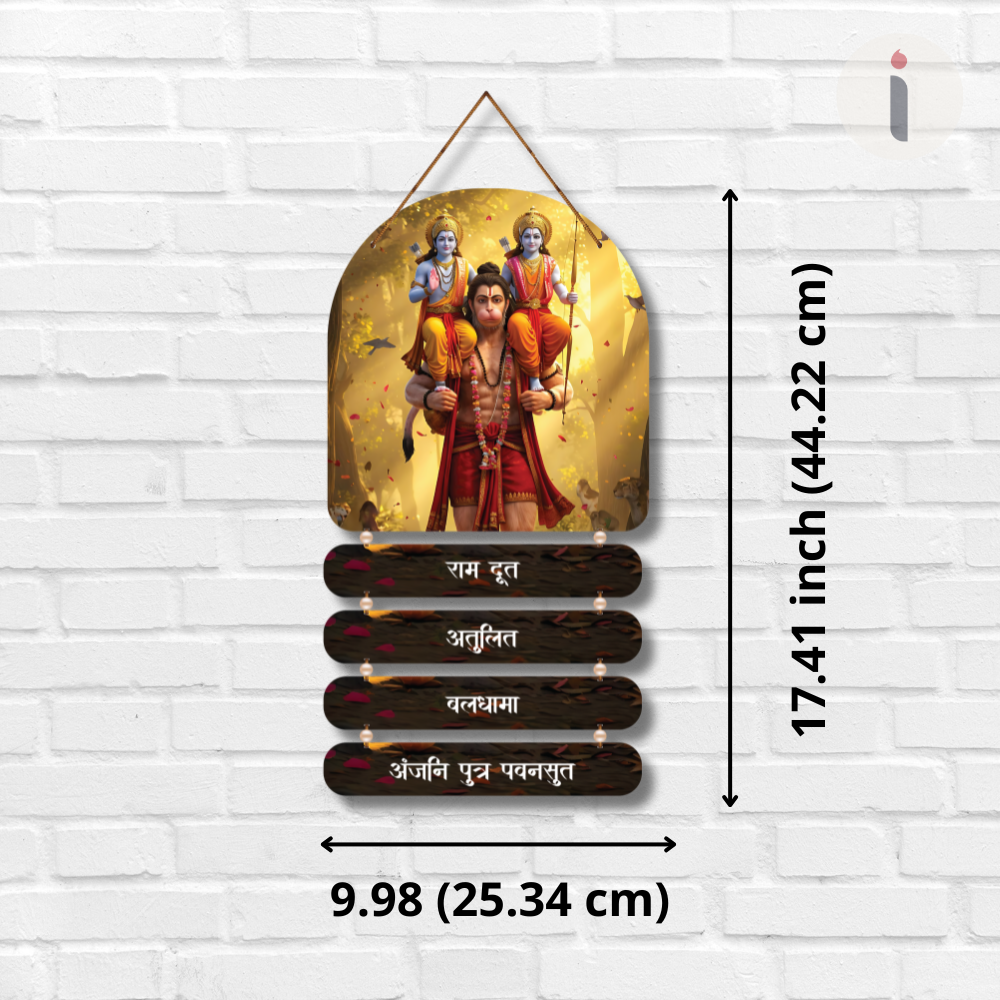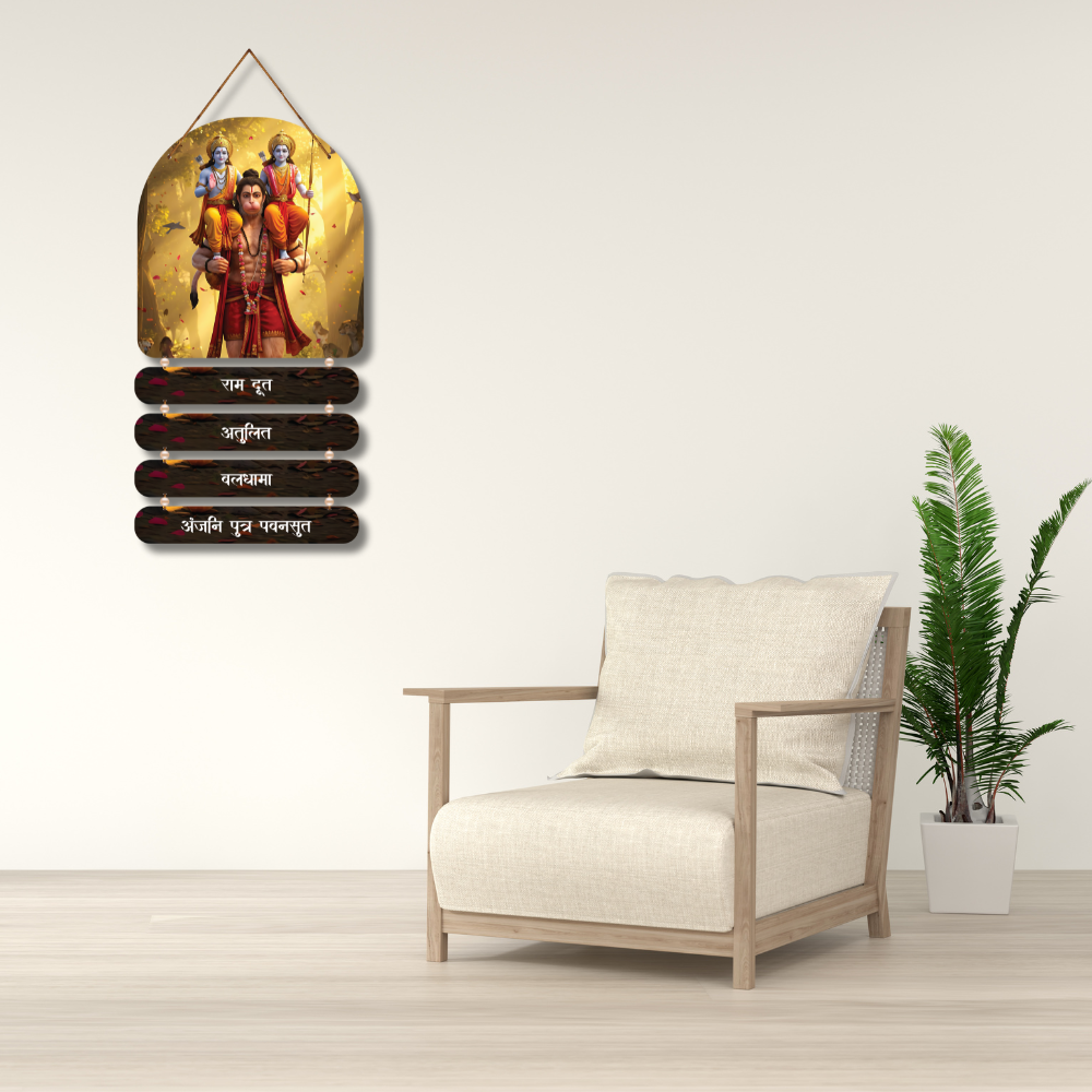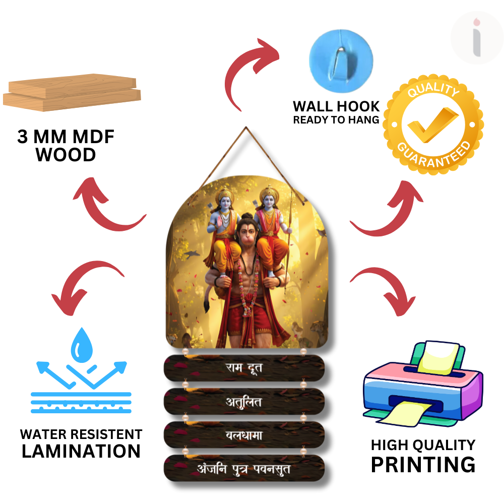 🚩 Invoke divine strength and devotion with this powerful wall hanging of Lord Hanuman carrying Ram and Lakshman. 🪔 A glowing golden backdrop adds sacred aura, while Hindi inscriptions “राम दूत”, “अतुलित बलधामा”, and “अंजनि पुत्र पवनसूत” honor his glory and might. 💪 Perfect for temples, meditation spaces, home entrances, or gifting spiritual protection and blessings. 🙏🔥