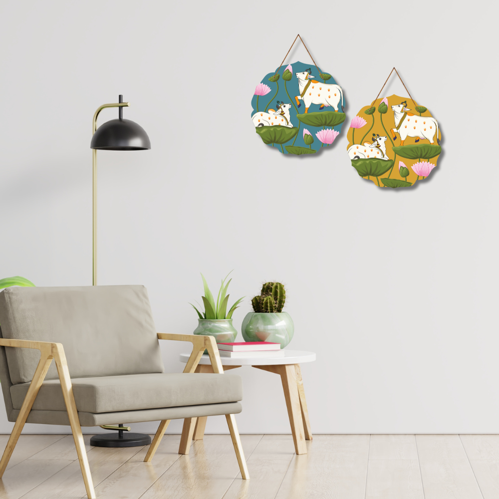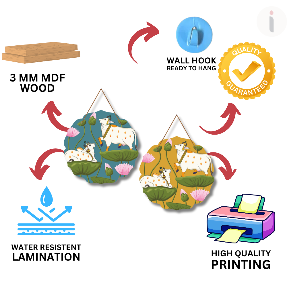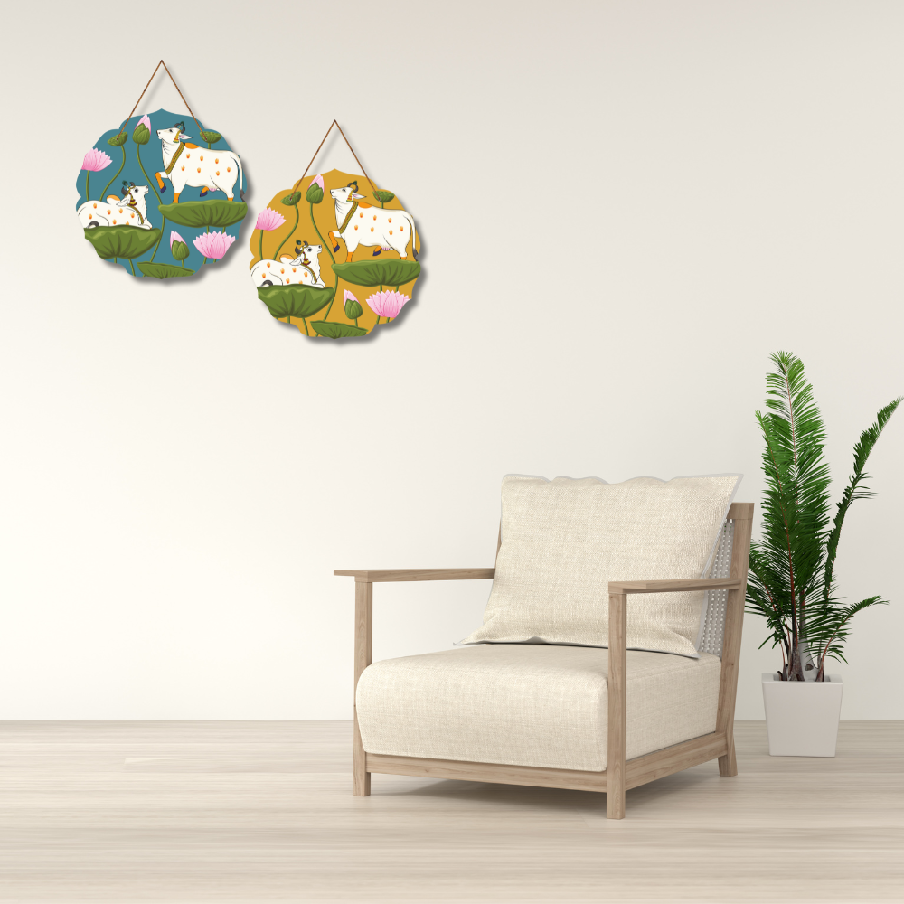 This beautifully crafted wall hanging features a sacred cow surrounded by blooming lotus flowers, symbolizing purity, peace, and prosperity. Available in vibrant blue and mustard backgrounds, it blends traditional art with spiritual essence. Perfect for pooja rooms, living spaces, or gifting, this piece brings a divine aura, positive energy, and cultural charm into any home décor.