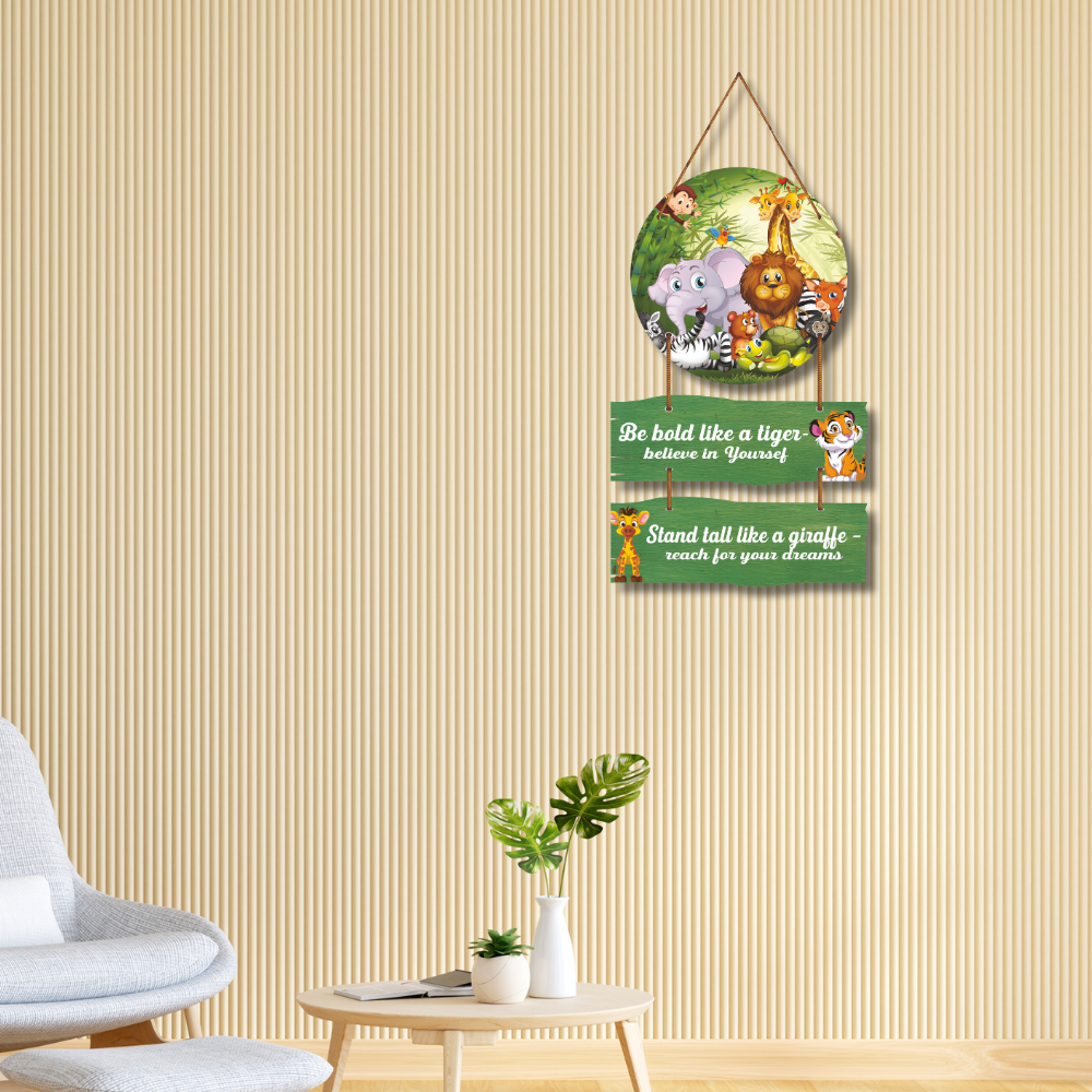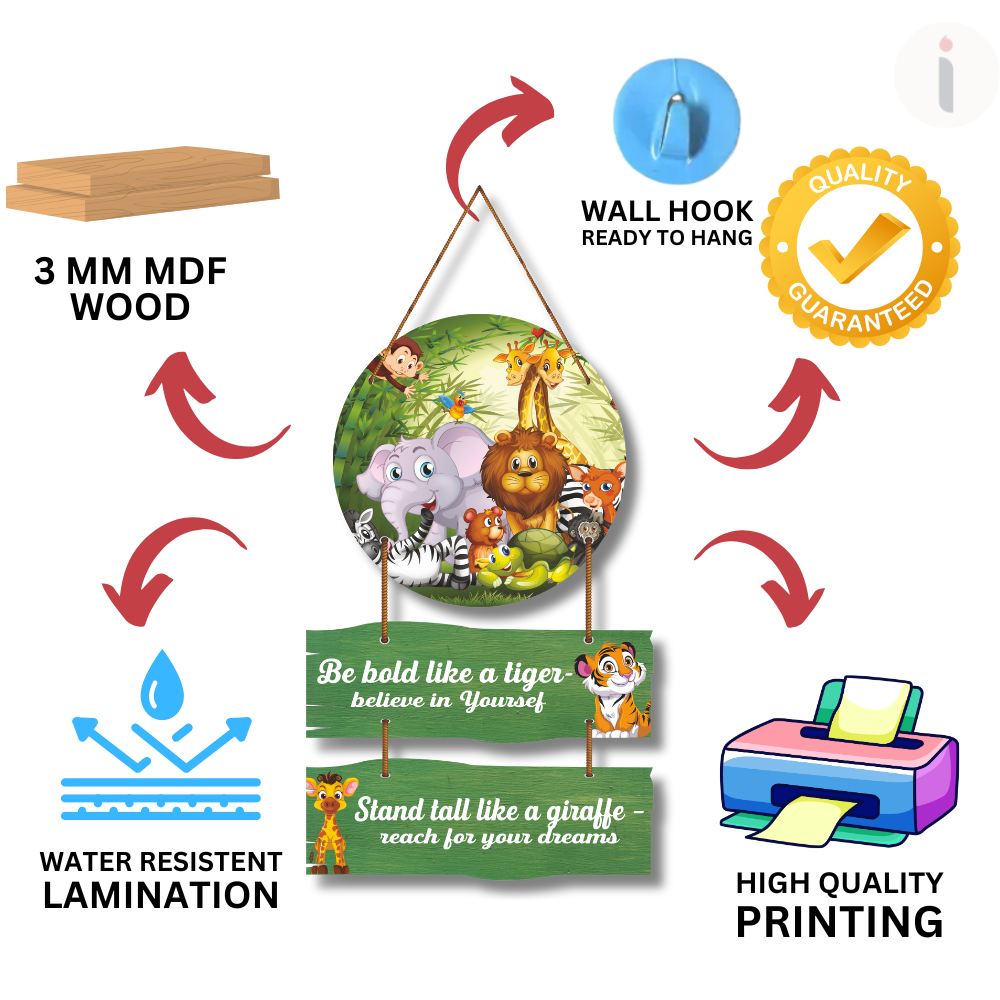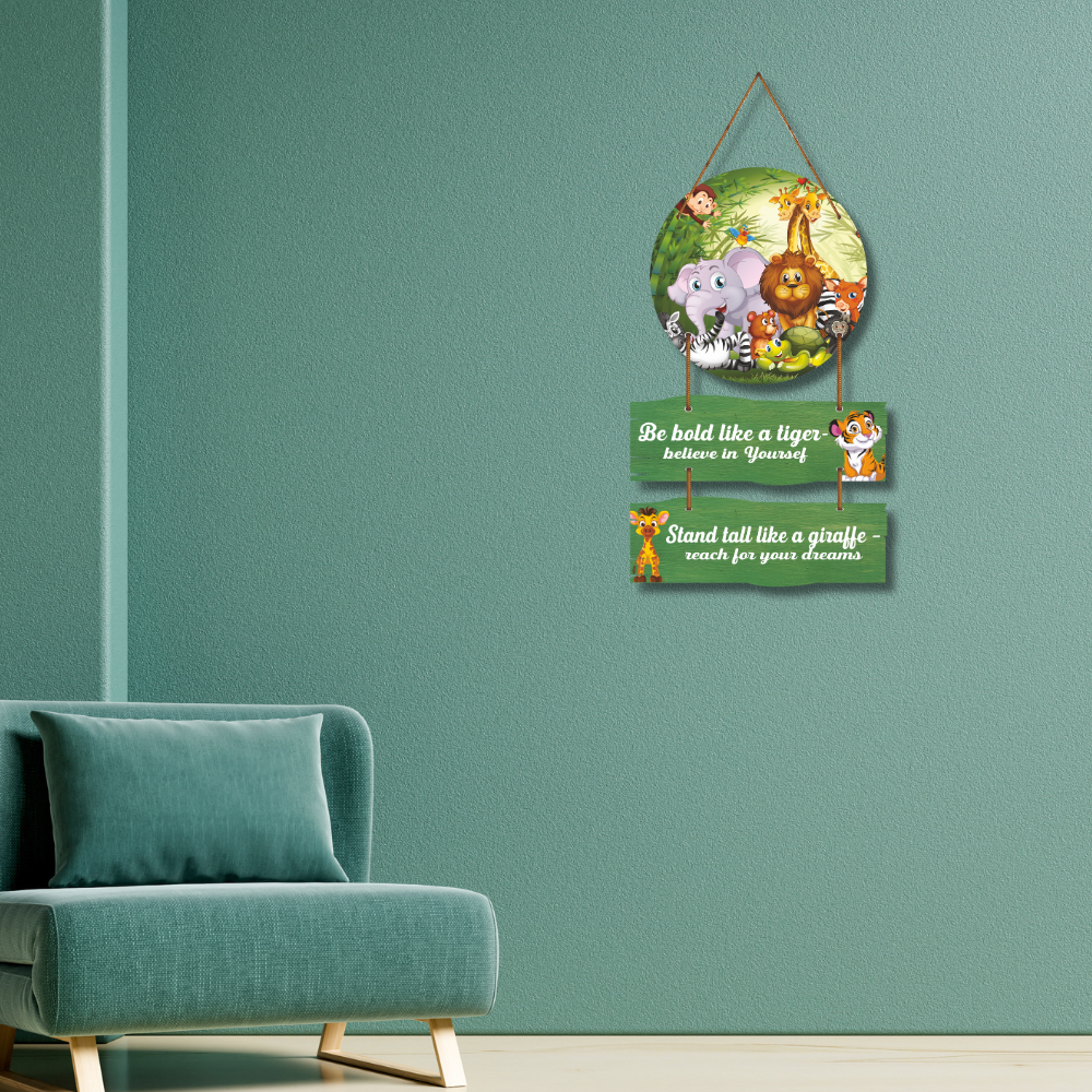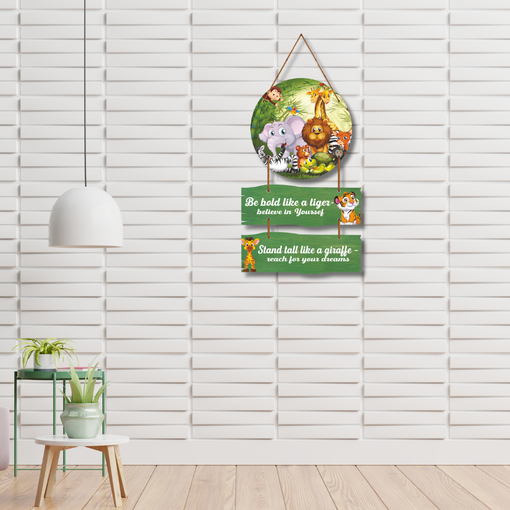 This playful jungle-themed wall hanging is filled with cheerful animals and motivational messages. Featuring a bold tiger reminding you to believe in yourself and a tall giraffe inspiring you to reach for your dreams, it’s perfect for kids’ rooms, classrooms, or play areas. Bright, colorful, and encouraging, it adds positivity and charm to any space.
