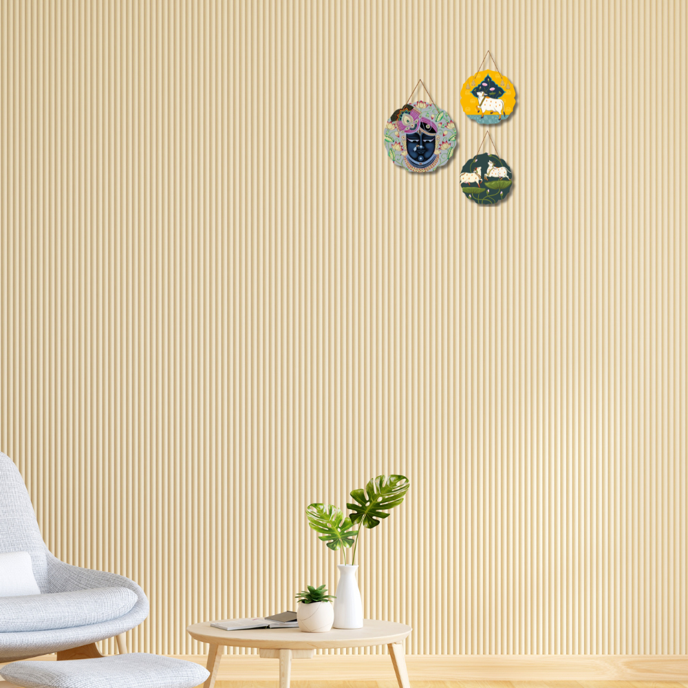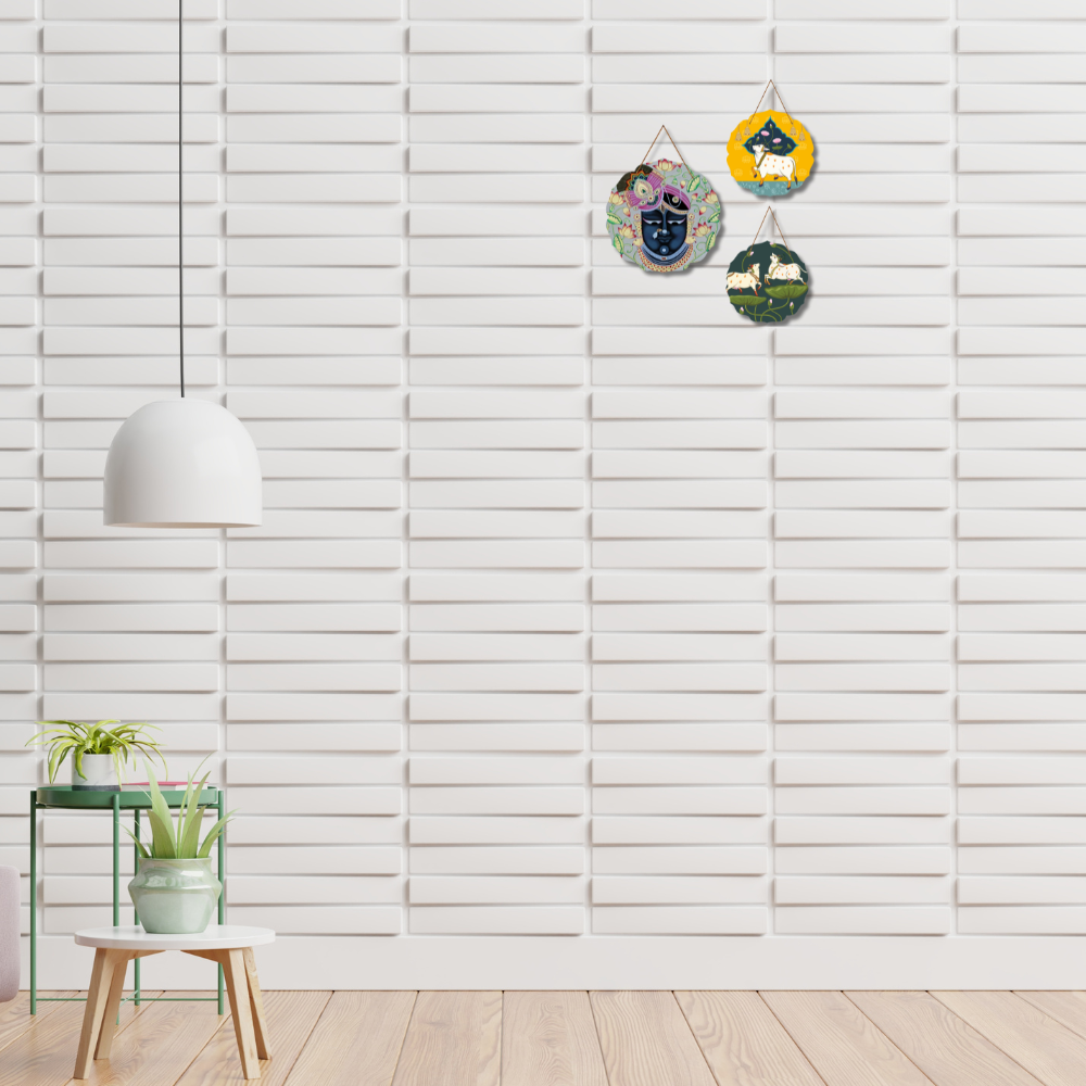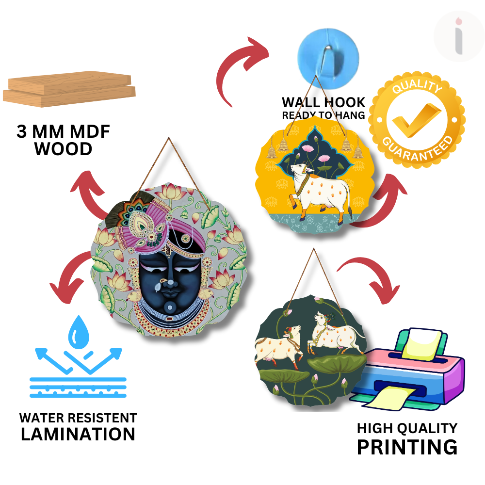 This beautiful wall hanging features the serene face of Shreenathji surrounded by lotus blooms, alongside sacred cows symbolizing purity and devotion. The vibrant artwork in traditional Pichwai style captures divine grace and spiritual charm. Perfect for temples, living rooms, or meditation spaces, it brings peace, prosperity, and a devotional aura to your home décor.
