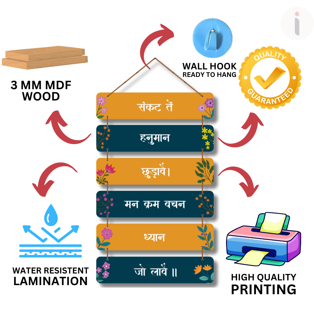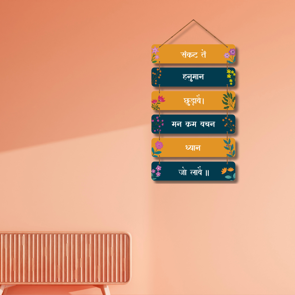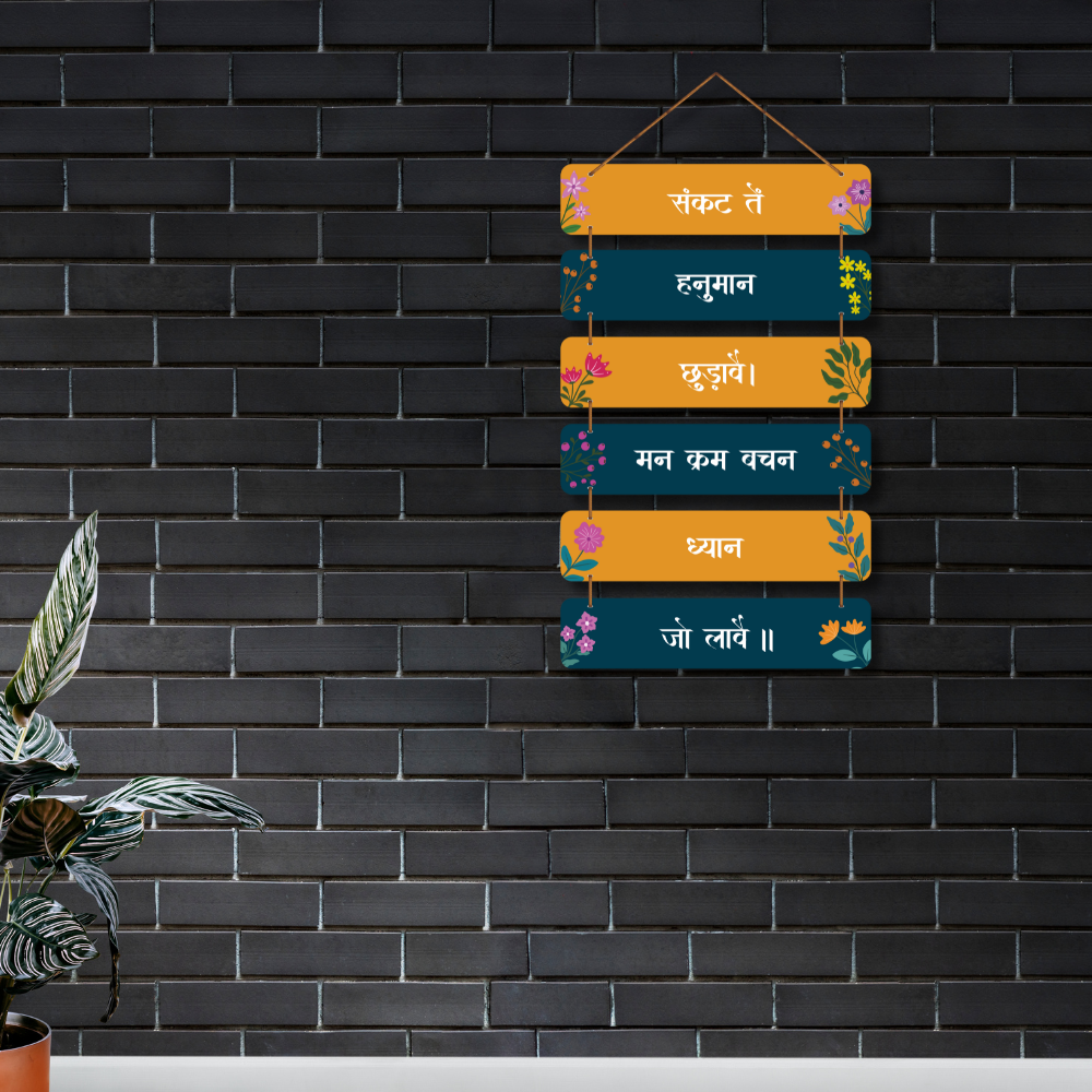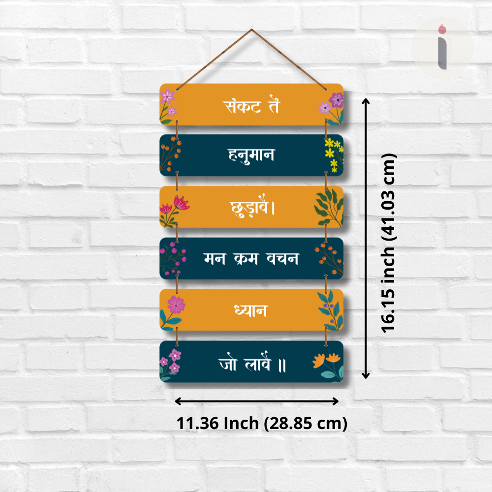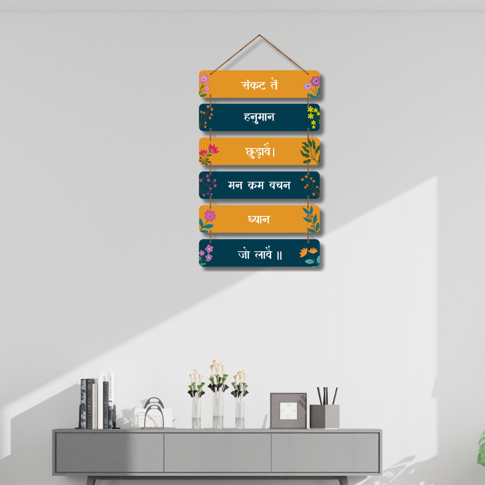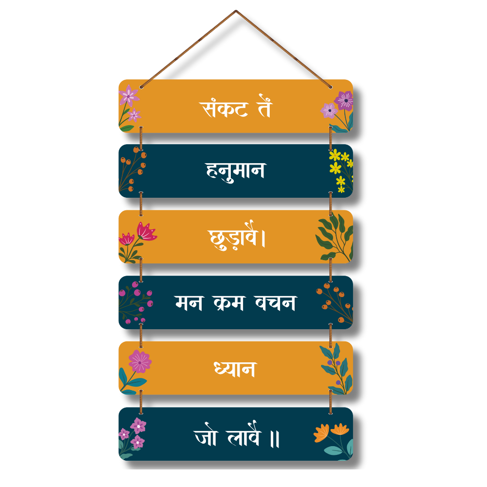 Bring divine assurance into your space with this Hanuman mantra wall hanging 🧡🙏 Featuring the powerful lines “Sankat Te Hanuman Chhudave, Man Kram Bachan Dhyan Jo Laave”, it symbolizes protection, focus, and faith. The soothing colors and floral accents create a balanced spiritual vibe, perfect for homes, temples, or meditation corners 🌸✨