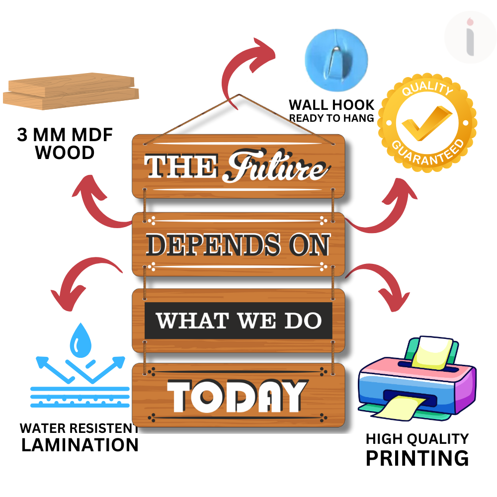 Motivate your day with this beautifully crafted wooden wall hanging that reads “The Future Depends on What We Do Today.” Designed with rustic charm and bold typography, it’s a perfect reminder for homes, offices, or study areas. Ideal for anyone seeking daily inspiration, this piece encourages focus, positivity, and the importance of present actions shaping tomorrow.