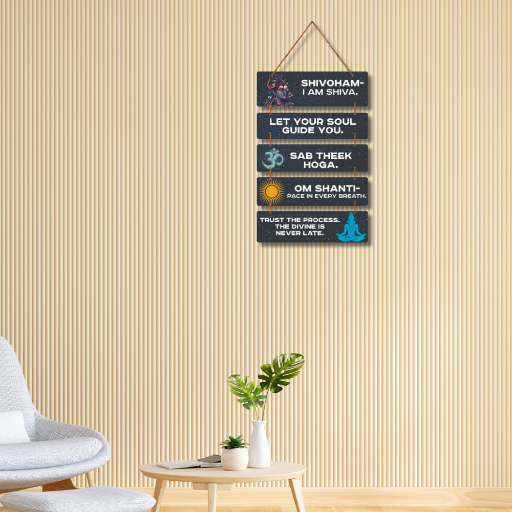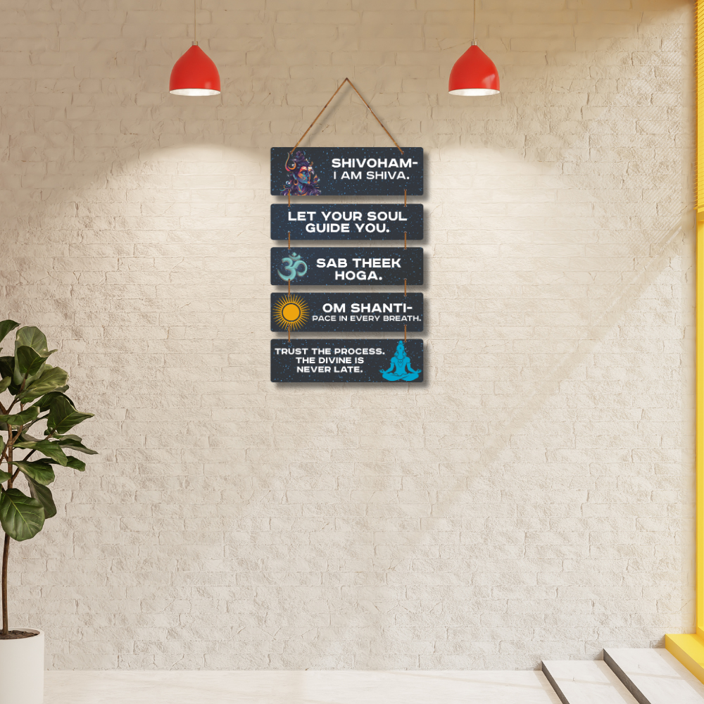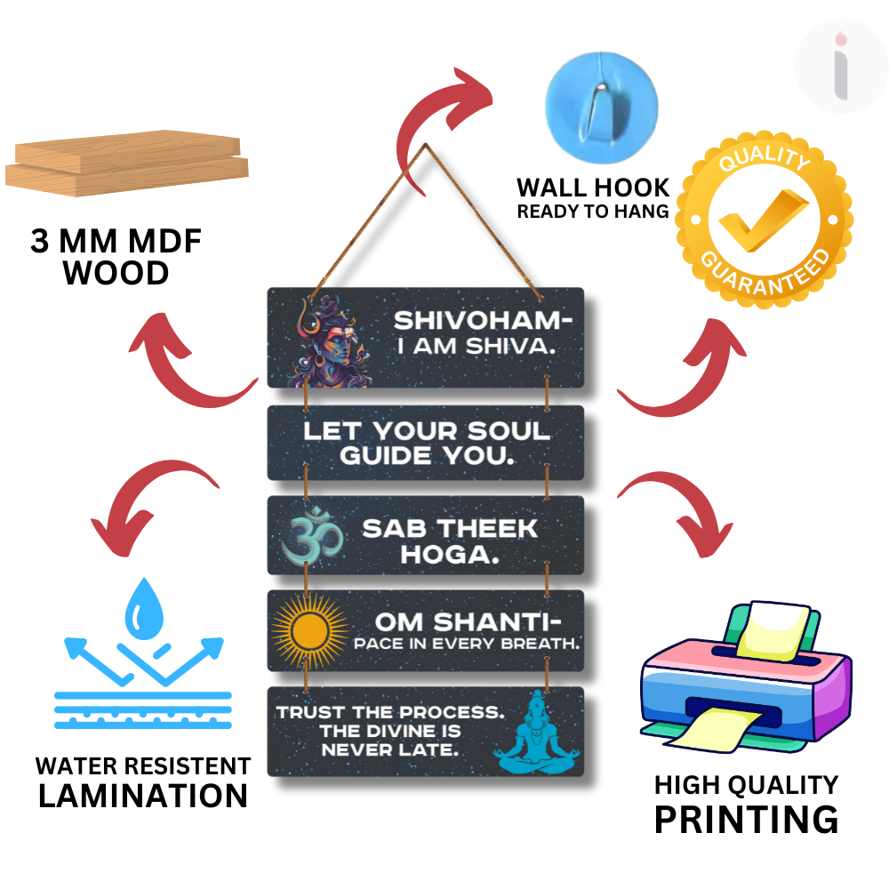 Embrace the essence of spirituality with this powerful Shivoham wooden wall hanging. Featuring uplifting quotes like “I am Shiva”, “Om Shanti – Peace in every breath” and “Trust the process, the divine is never late”, it radiates strength, calm, and faith. Perfect for pooja rooms, meditation corners, or gifting spiritual inspiration.