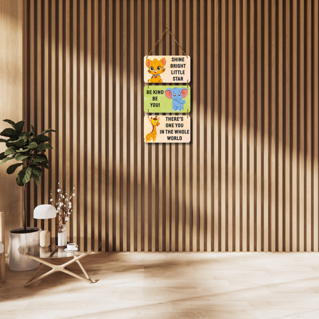 Make your child’s room a haven of positivity and cuteness with this charming motivational animal-themed wall hanging. Featuring three friendly illustrated animals — a kitty, an elephant, and a giraffe — paired with uplifting quotes, this décor inspires kindness, confidence, and self-love. Perfect for nurseries, playrooms, classrooms, or gifting on birthdays, this hanging is a daily dose of encouragement wrapped in adorable charm.