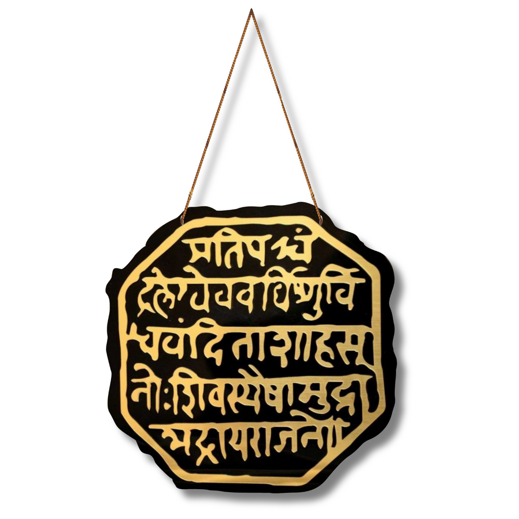Carved in a traditional Devanagari script and painted in bold golden tones over a black, uneven-edged wooden plaque, this wall decor piece radiates divine presence and aesthetic rustic charm.