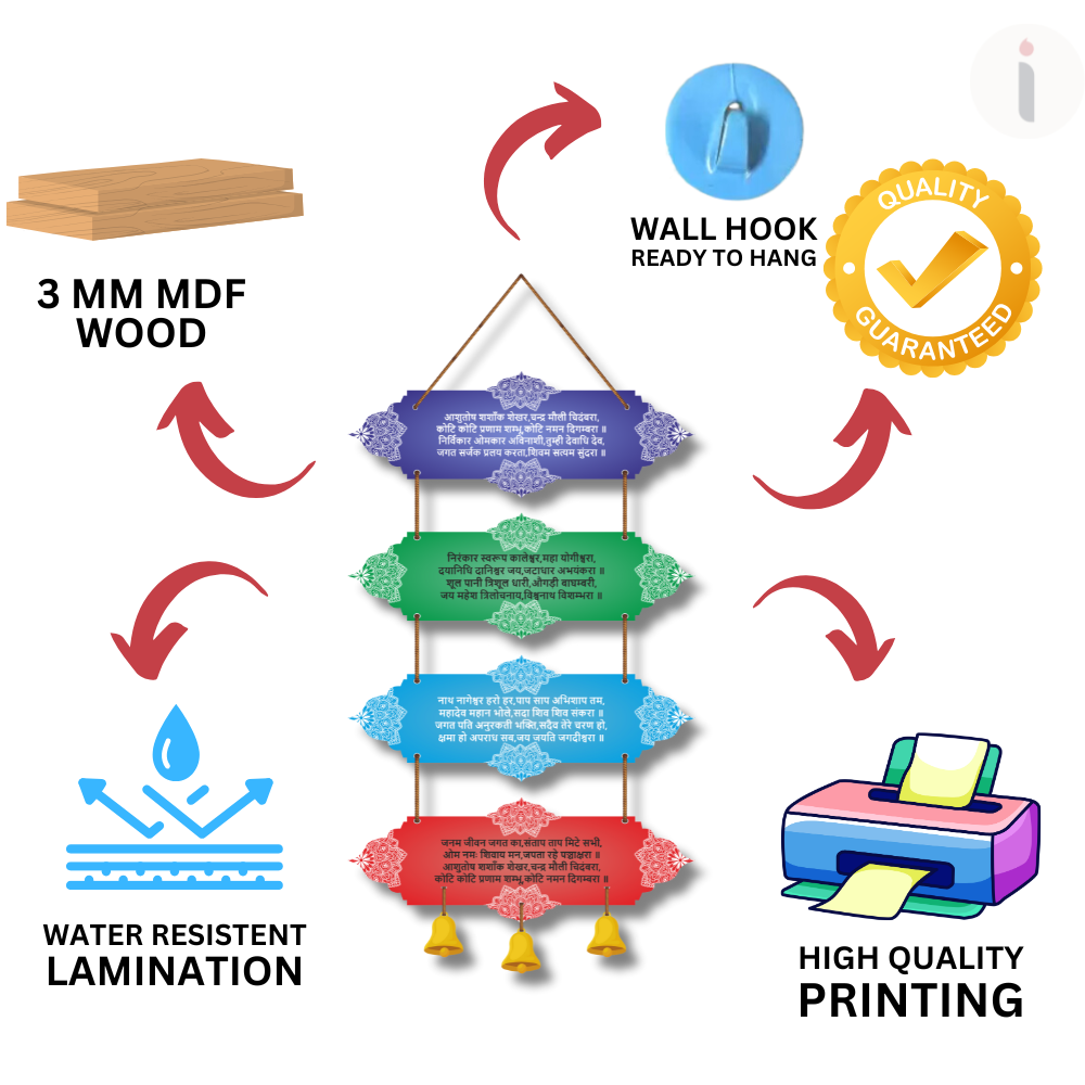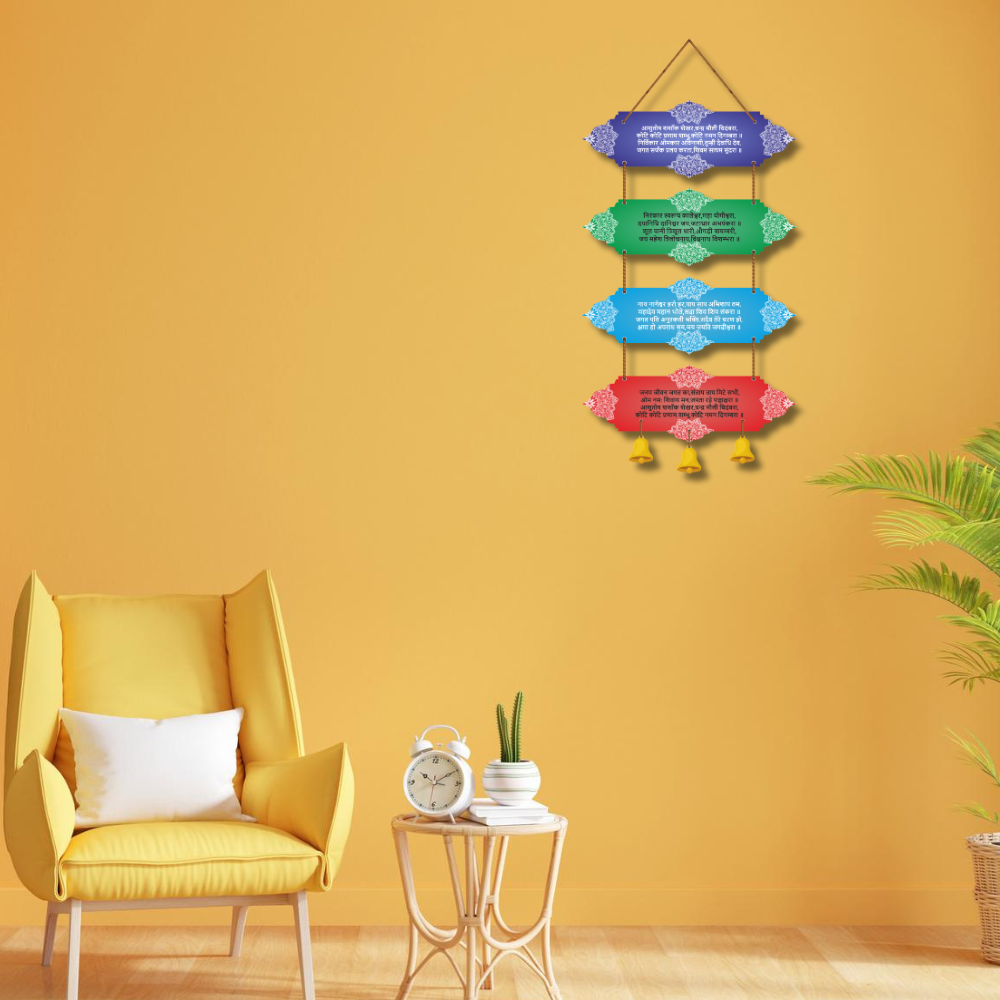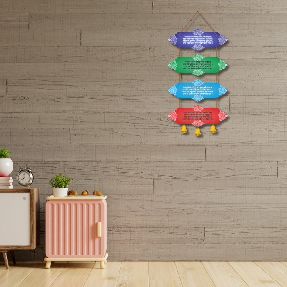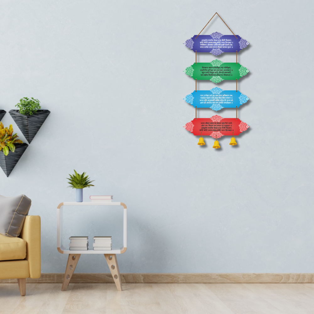 Celebrate devotion and divine energy with this vibrant Shiv Tandav Stotram Wall Hanging, featuring sacred Sanskrit verses dedicated to Lord Shiva. Designed in a beautiful vertical format with colorful plaques in purple, green, blue, and red, each section is adorned with traditional Indian motifs and powerful slokas.