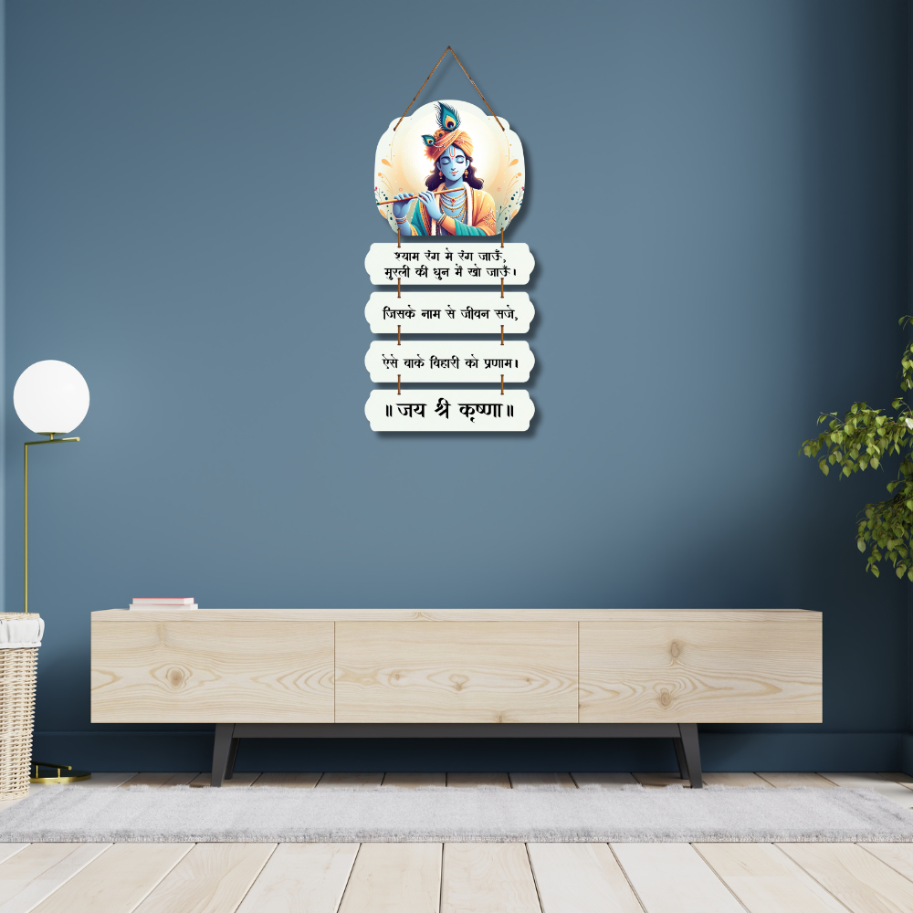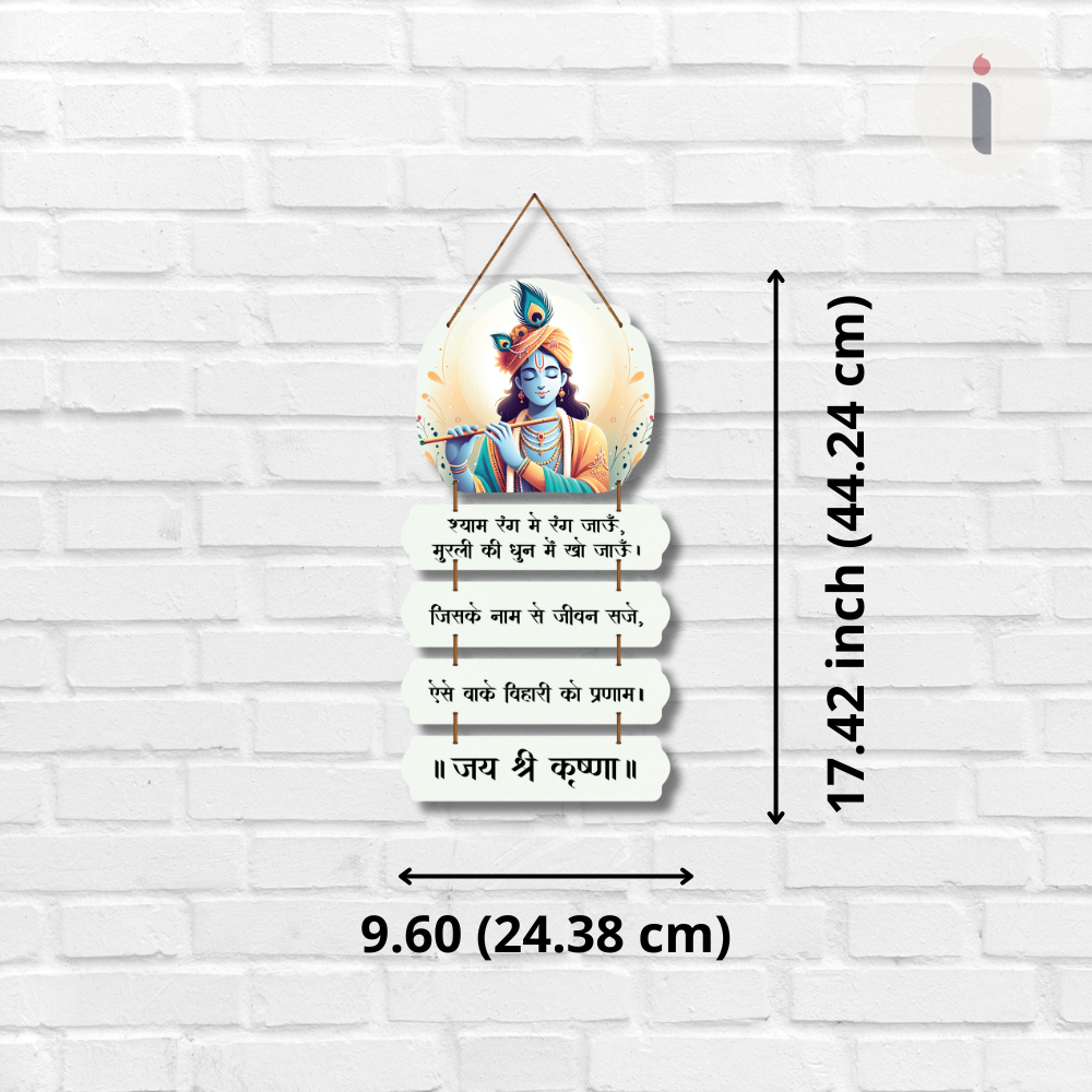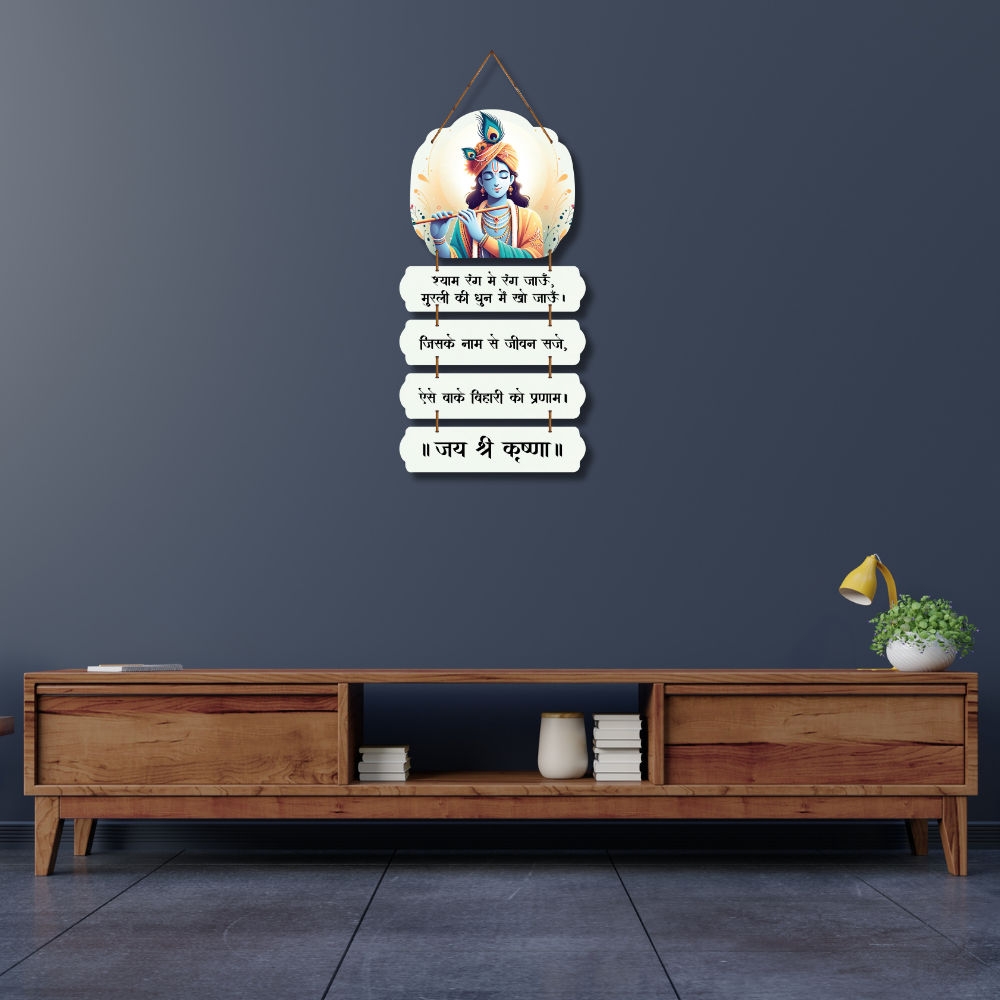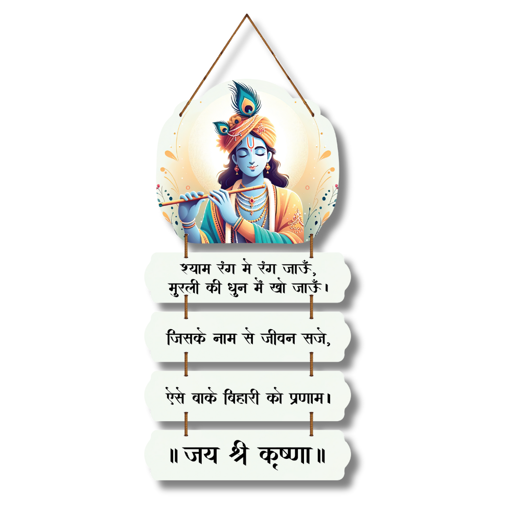 🌸 Bring divine melody and serenity into your space with this beautiful Lord Krishna wall hanging. 🎶💙 Depicting Shyam playing the flute, it features soulful Hindi verses that celebrate devotion, joy, and life’s harmony. Perfect for living rooms, pooja corners, meditation spaces, or gifting spiritual love. 🙏✨ Let Krishna’s flute fill your home with peace and positivity. 🦚💫