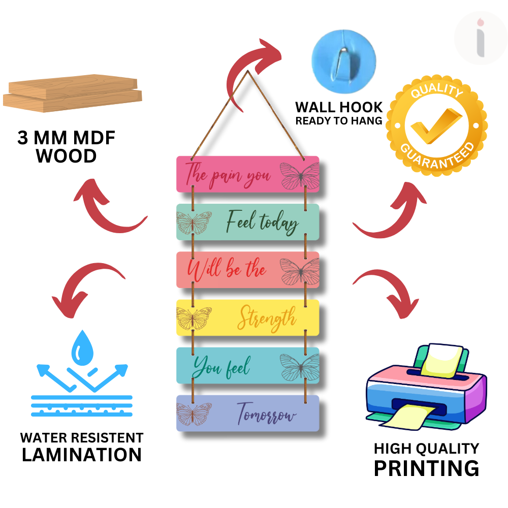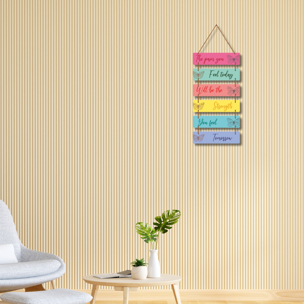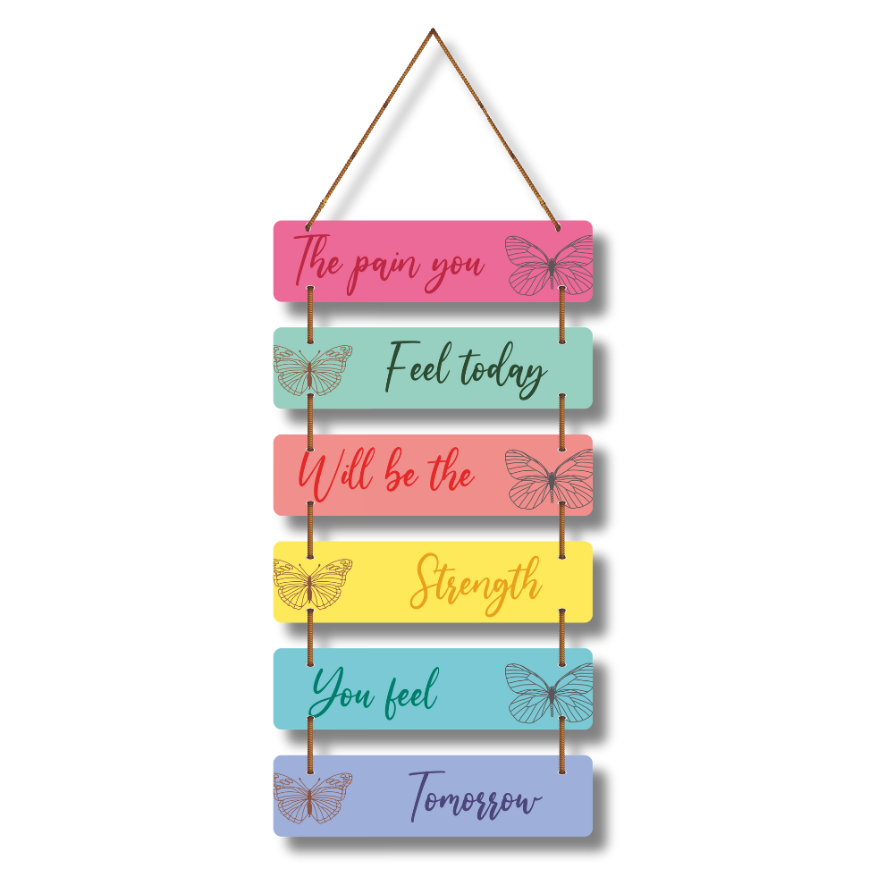Brighten your space with this colorful motivational wooden wall hanging. Featuring the inspiring quote “The pain you feel today will be the strength you feel tomorrow” with delicate butterfly designs, it reminds us that challenges build resilience. Perfect for study rooms, offices, gyms, or as a thoughtful gift to uplift and inspire loved ones.