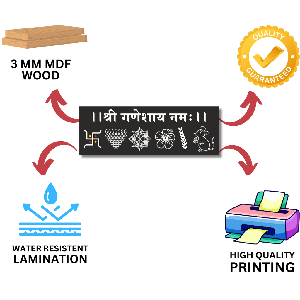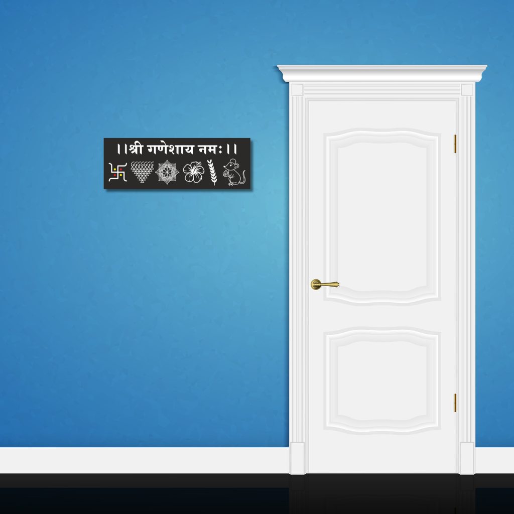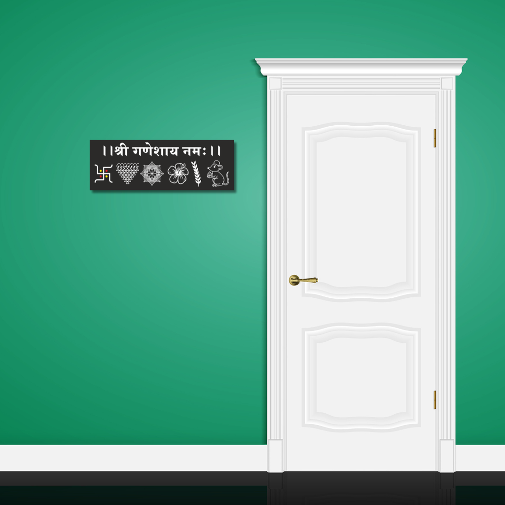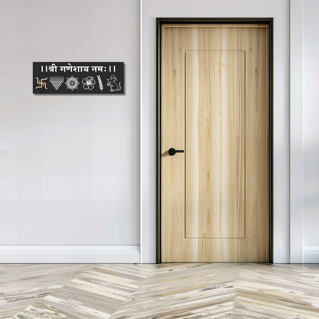 The bold white text “श्री गणेशाय नमः” stands out gracefully on a deep black background, making the piece visually striking and spiritually uplifting. Accompanying the sacred inscription are intricate devotional symbols including Swastik for good luck, Shree Yantra for divine energy, Modak symbolizing blessings, Bilva leaves for purity, and Mushak (Mouse) — the divine vahana of Lord Ganesha. Each symbol carries spiritual depth and cultural significance, harmoniously blending to create a powerful aura around your entrance or pooja space.