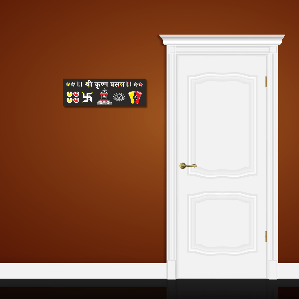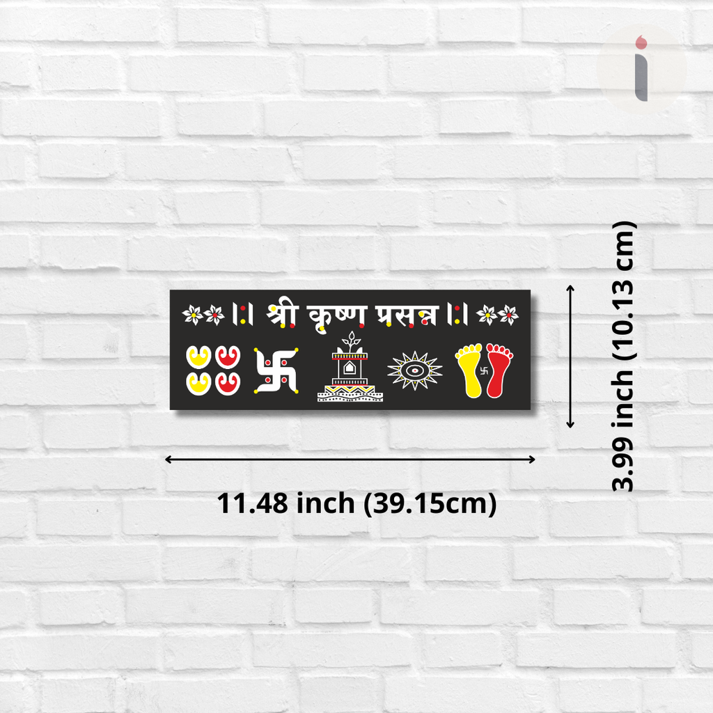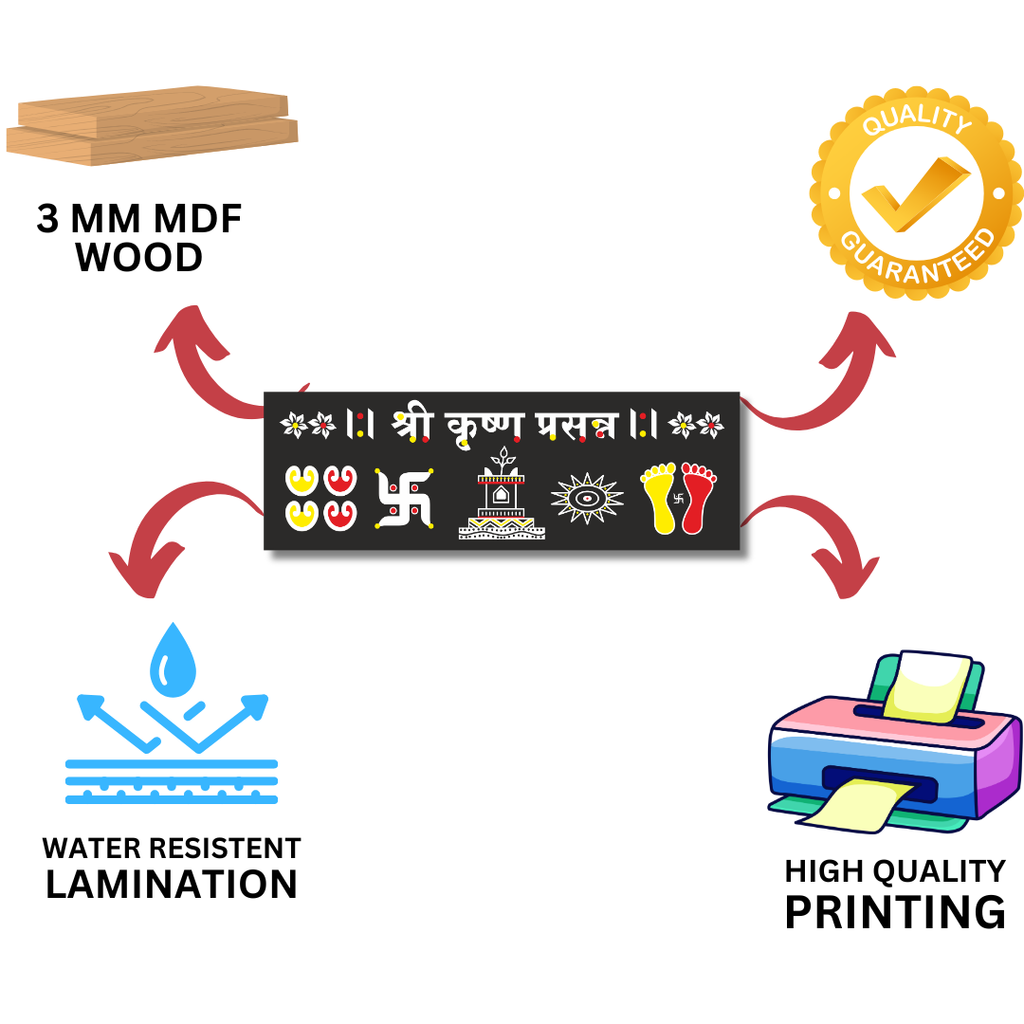The elegant white Devanagari inscription “श्री कृष्ण प्रसन्न” shines gracefully on the black wooden background, creating a divine aura that instantly catches attention. Enhanced with delicate floral decorative borders on both sides, the plate reflects purity, joy, and the divine charm of Krishna.