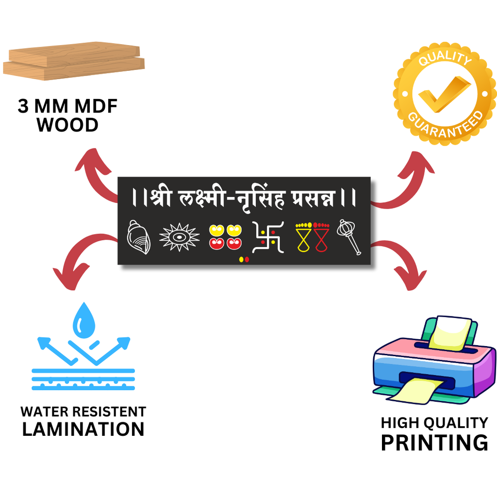 Invite the combined divine blessings of Mata Lakshmi—the Goddess of wealth, abundance and purity—and Lord Nrusinh—the fierce protector and remover of negativity—into your home with this beautifully crafted “श्री लक्ष्मी–नृसिंह प्रसन्न” Wooden Wall Name Plate. This premium spiritual plaque is designed to bring peace, prosperity, strength, and protection to the home where it is placed.