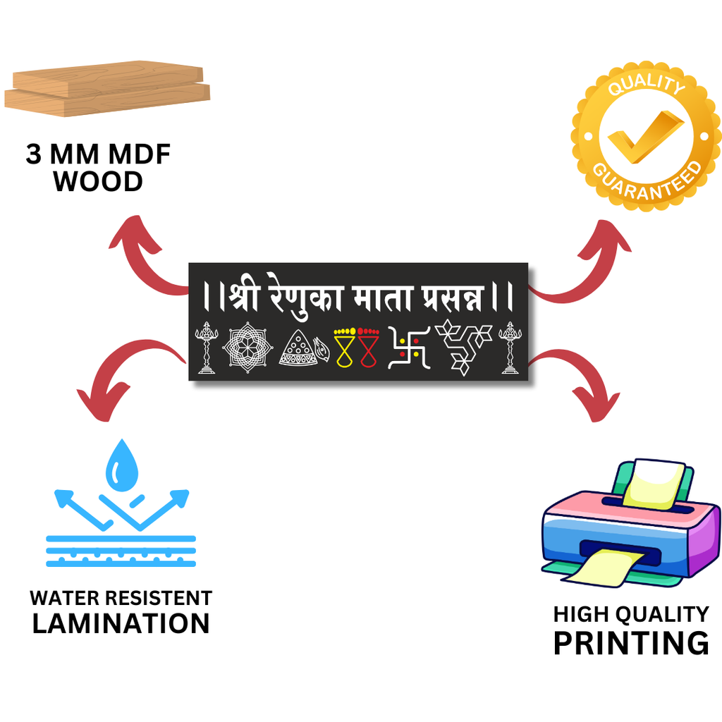 Bring the sacred blessings of Shri Renuka Mata, the embodiment of strength, purity and divine motherhood, into your home with this beautifully crafted “श्री रेणुका माता प्रसन्न” Wooden Wall Name Plate. Designed to radiate spiritual protection and positive energy, this premium wooden plaque is perfect for adorning your main entrance, pooja room door, temple area, or sacred corner.